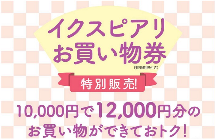 10,000円のお買い物券に2,000円分のプレミアムを付けた「イクスピアリお買い物券(有効期限付き)」を10,000円で販売。