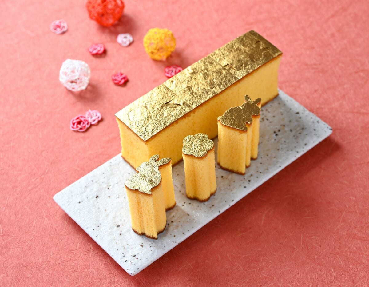 干支“うさぎ”の切り抜き加工をあしらった金箔を貼ったカステラや型抜きバウムを販売します。