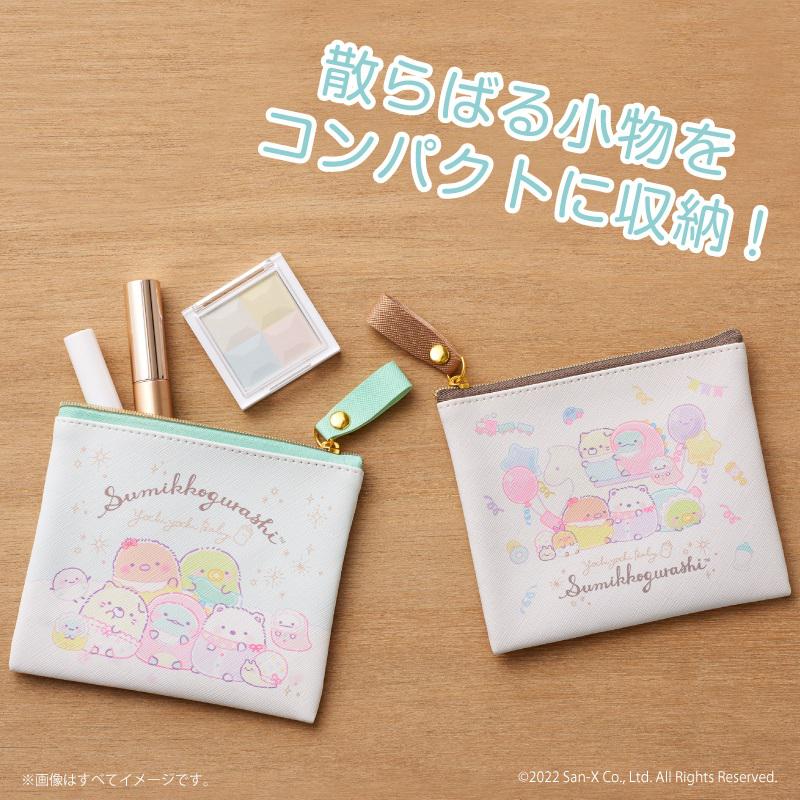 赤ちゃんになった「すみっコ」たちがかわいい、アクリルキーホルダーとフラットなミニポーチです。