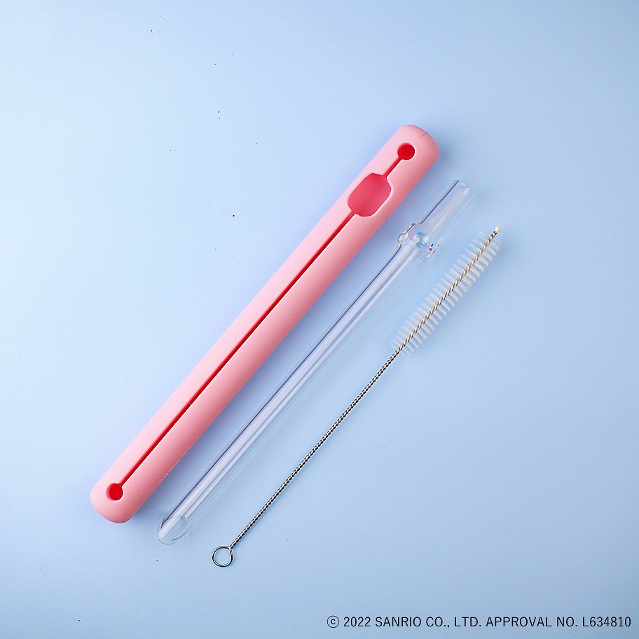 ガラス製マイストローは繰り返し使え、持ち運びに便利なシリコンケースとお手入れ用のブラシがセットになっています。