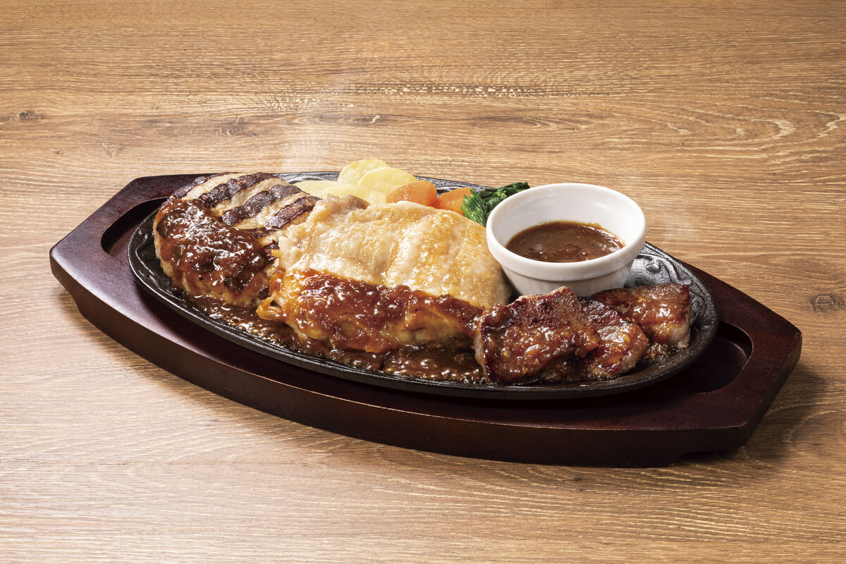 ハンバーグ、チキン、ステーキと3種類のグリルを鉄板にのせた「GRILLブラザーズ」