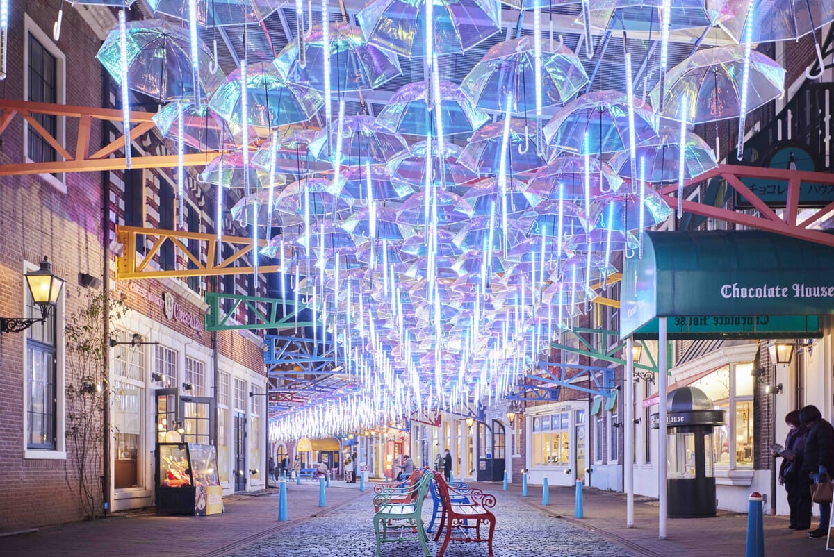 約700本の傘と光が彩る幻想的なアーケード!