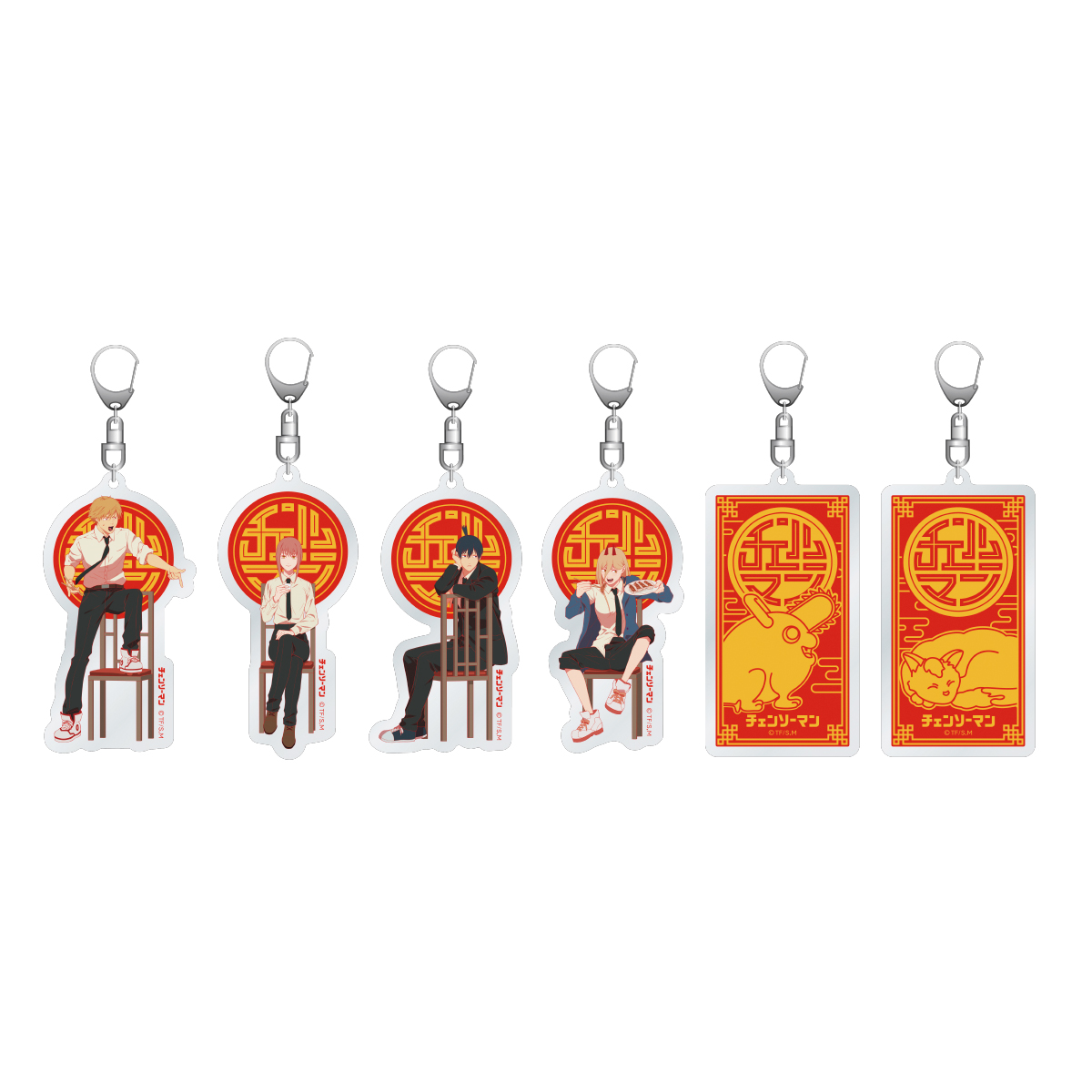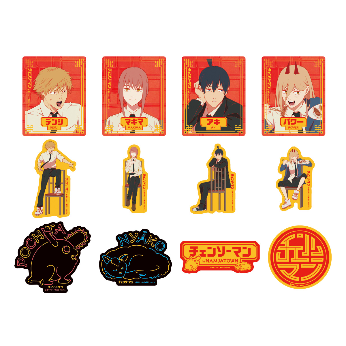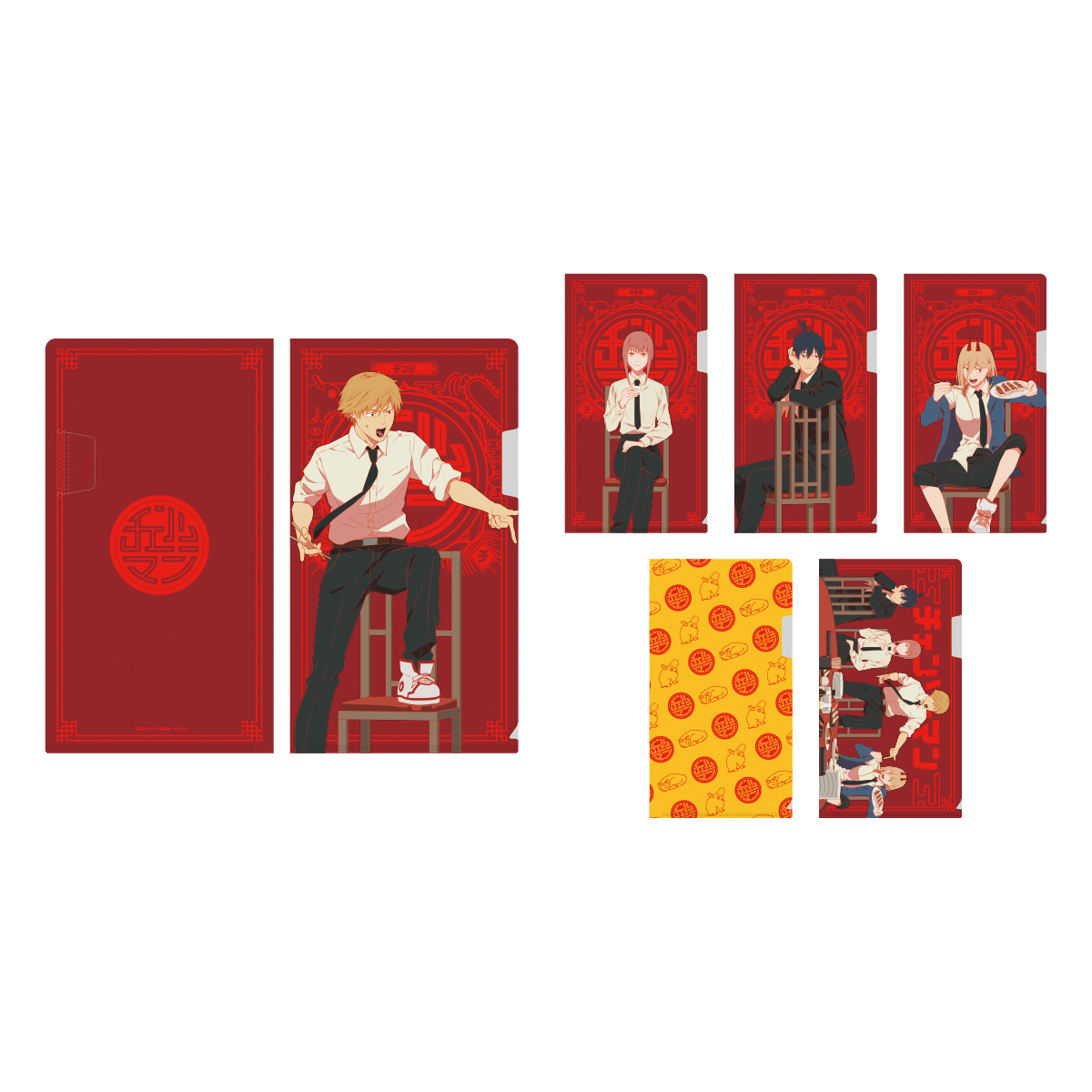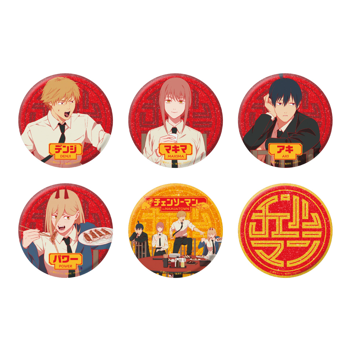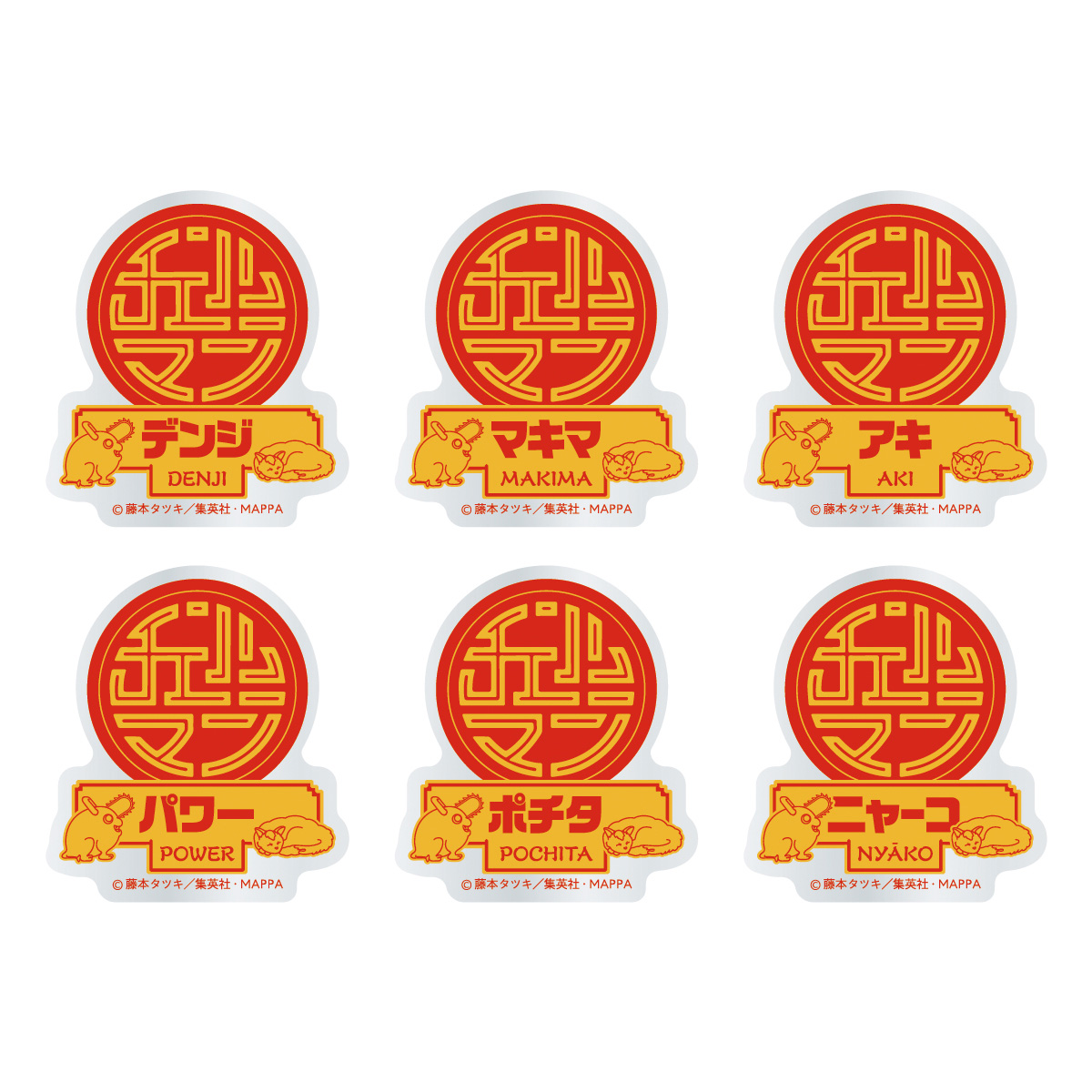 「デンジ」「マキマ」「早川アキ」「パワー」それぞれの絵柄と、4人の集合絵、『チェンソーマン』ロゴの全6種類です。