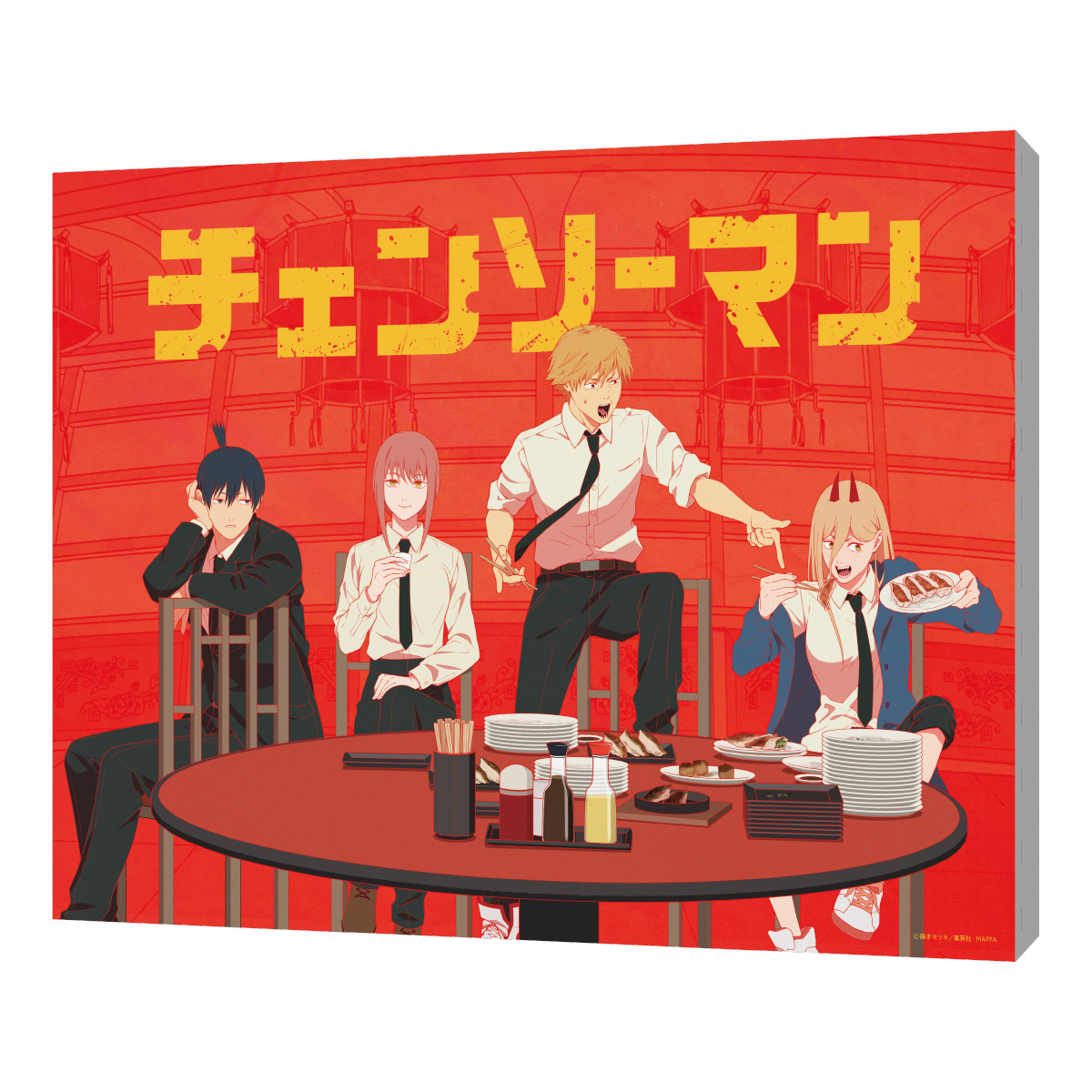 「デンジ」「マキマ」「早川アキ」「パワー」の4人が餃子の並ぶテーブルを囲む姿の描き下ろしイラストとなって登場します☆