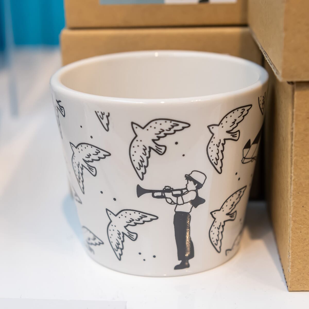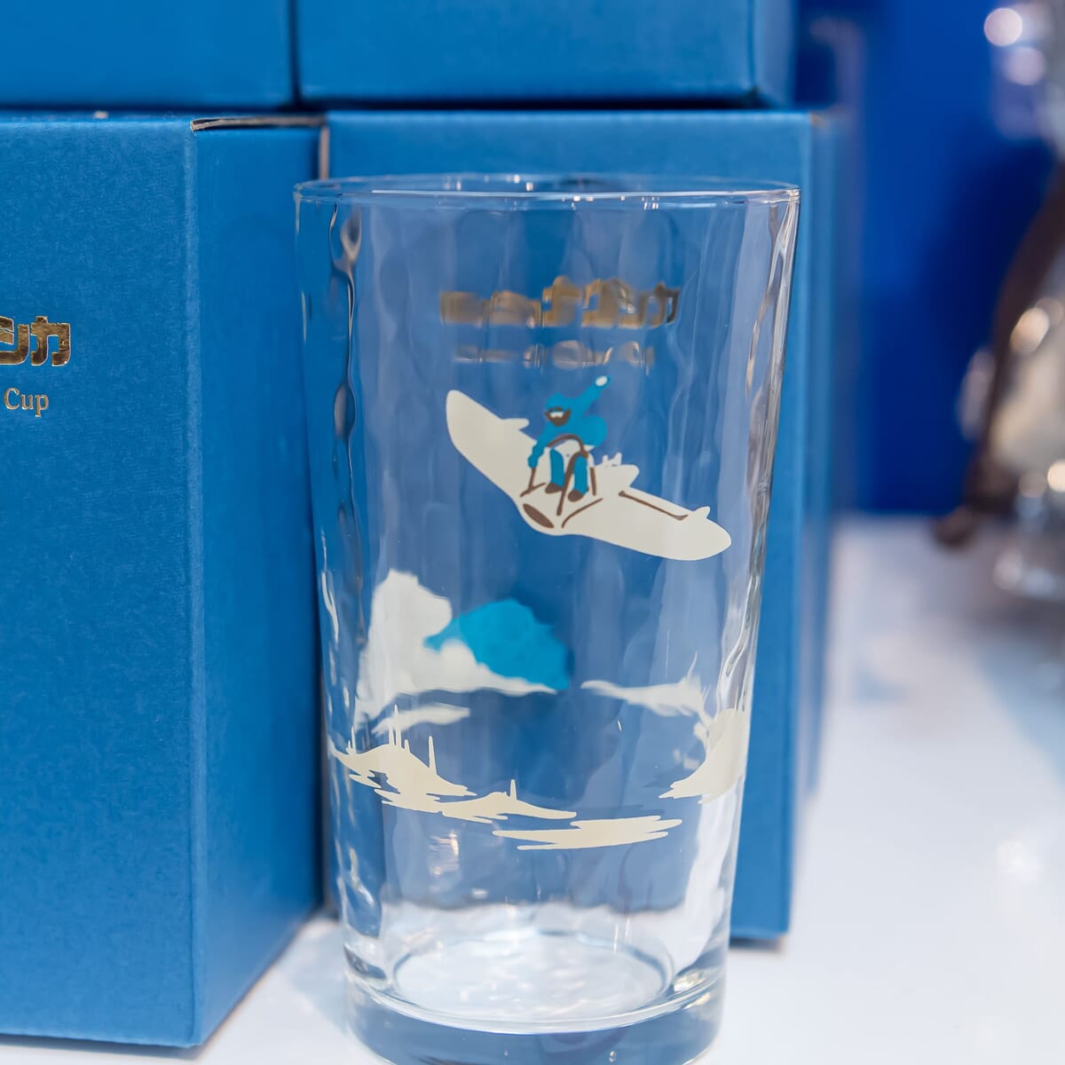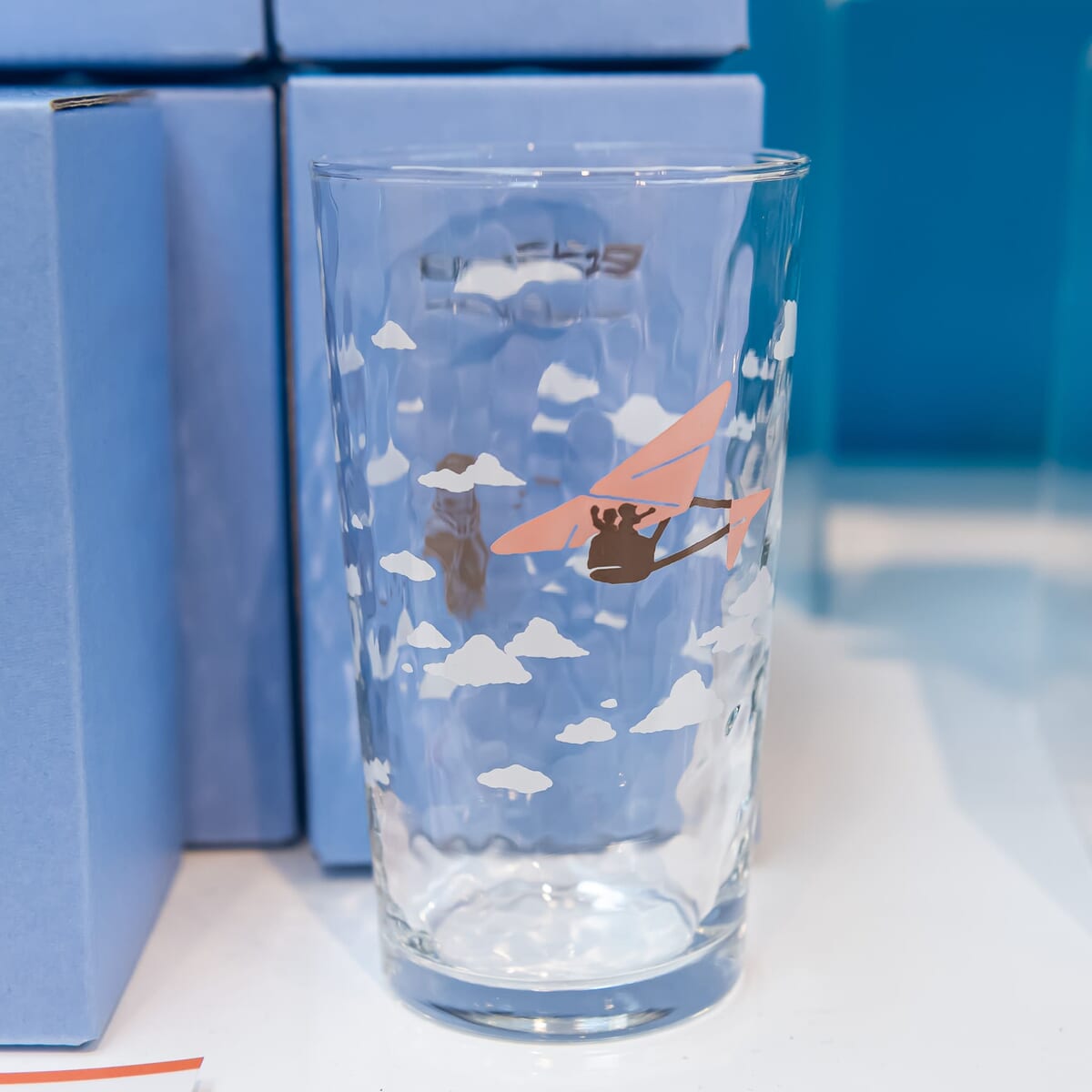 空を飛ぶシーンをプリントしたグラスコップ。