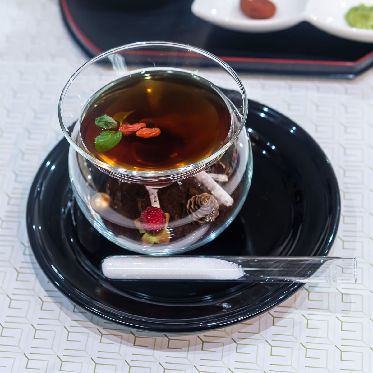 クコの実を浮かべた温かい紅茶。
