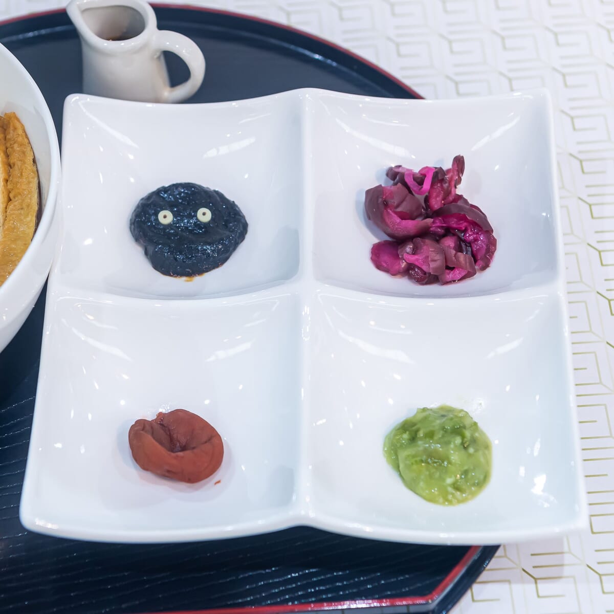 付けあわせは梅干し、海苔、漬物です。
