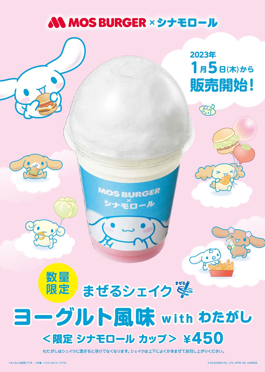 全国のモスバーガー店舗にて2023年1月5日より販売が開始される「まぜるシェイク ヨーグルト風味 with わたがし<限定 シナモロール カップ>」の紹介でした☆