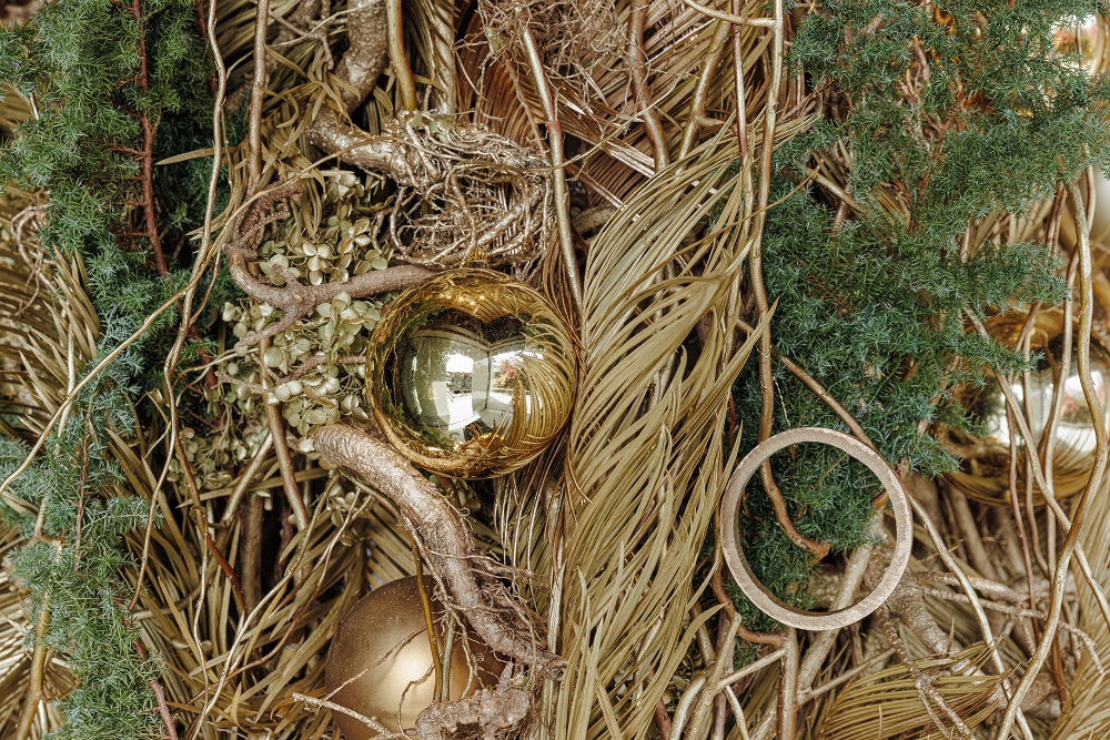 フローリストがひとつひとつ手作業でゴールドに色付けし、合計6種類の再利用素材を組み合わせて、華やかながらも趣のあるクリスマスツリーに仕上げられています。