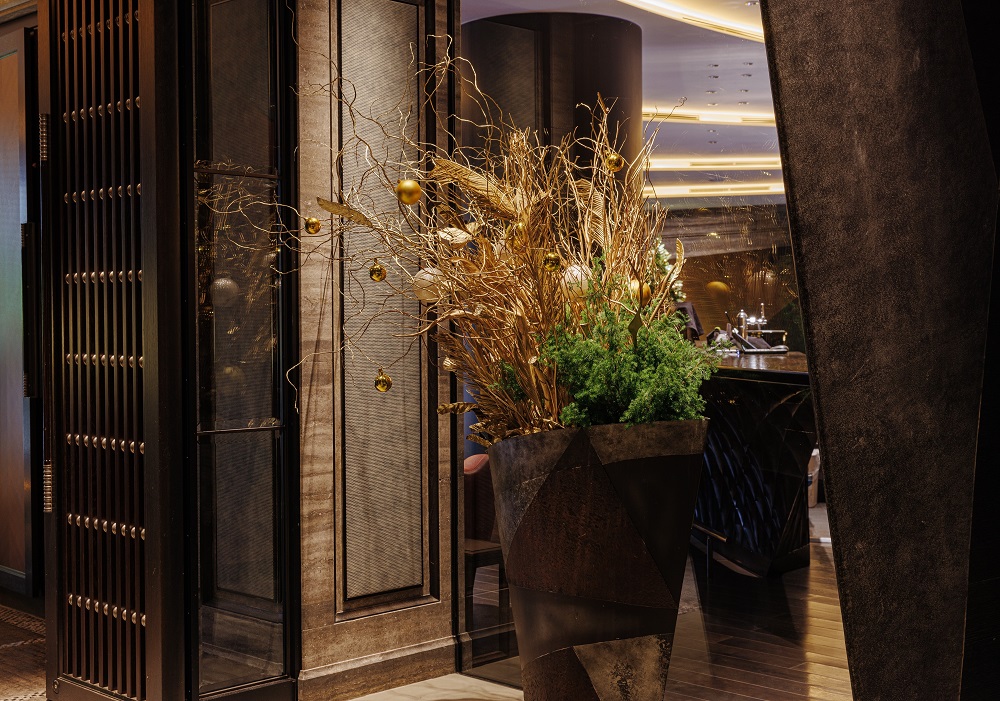ロビーに配された高さ約2mの「サステナブル・クリスマスツリー」は、2021年も使用した「七夕の竹」「枯れた盆栽」「ソテツ」に加え、新たに「紫陽花」「ドラゴン柳」「グレビレア」も再利用。