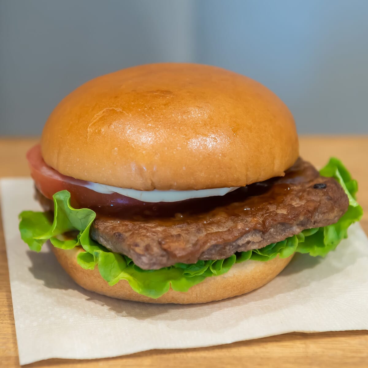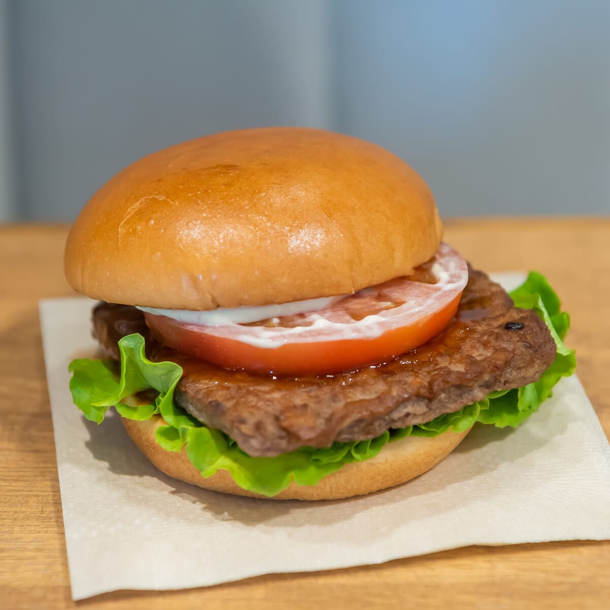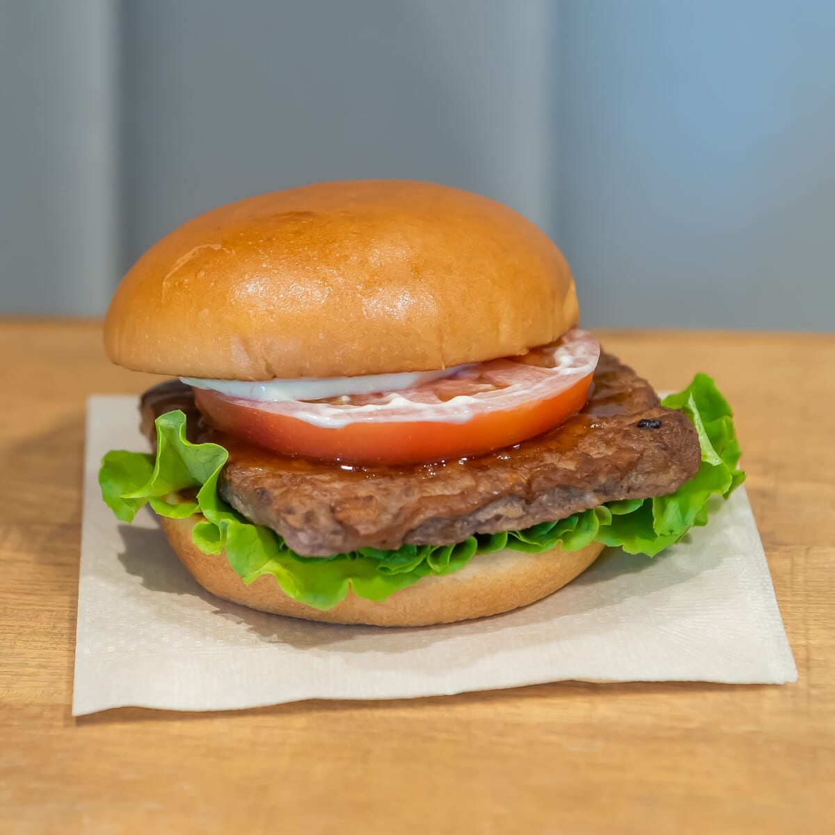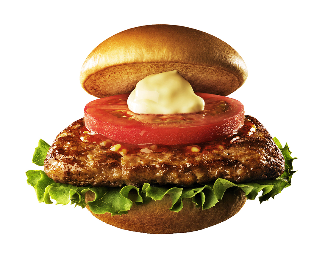 グリーンリーフに黒毛和牛パティをのせて、専用の「特製テリヤキソース」をかけ、マヨネーズタイプと輪切りのトマトを合わせたハンバーガー。