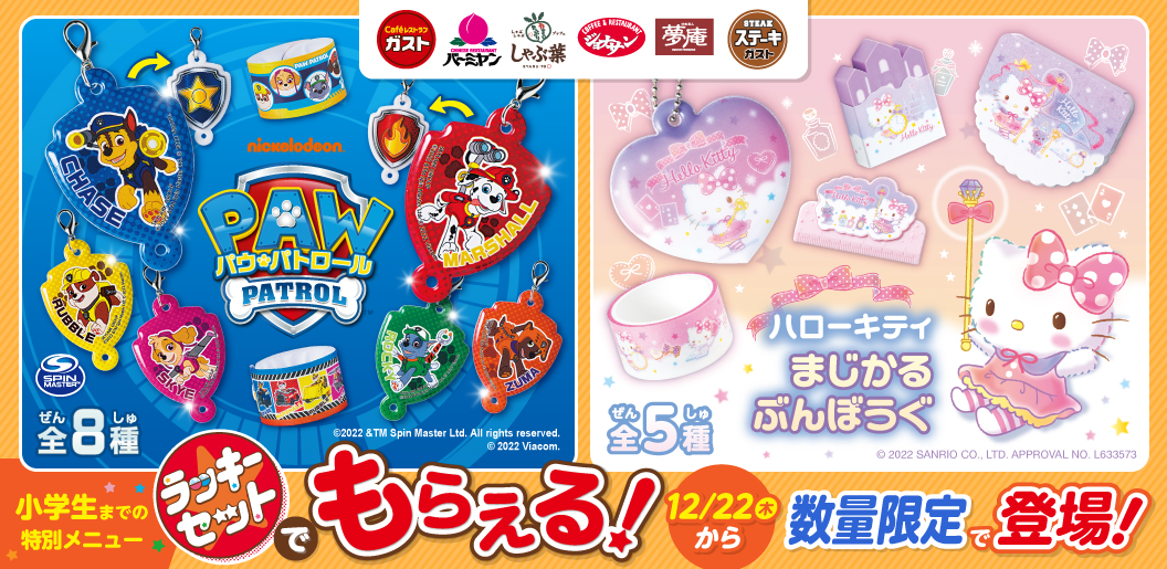 限定ガチャ「パウ・パトロール」&「ハローキティ」は、ガスト・バーミヤン・しゃぶ葉・ジョナサン・夢庵・ステーキガストにて、2022年12月22日(木)より登場です。