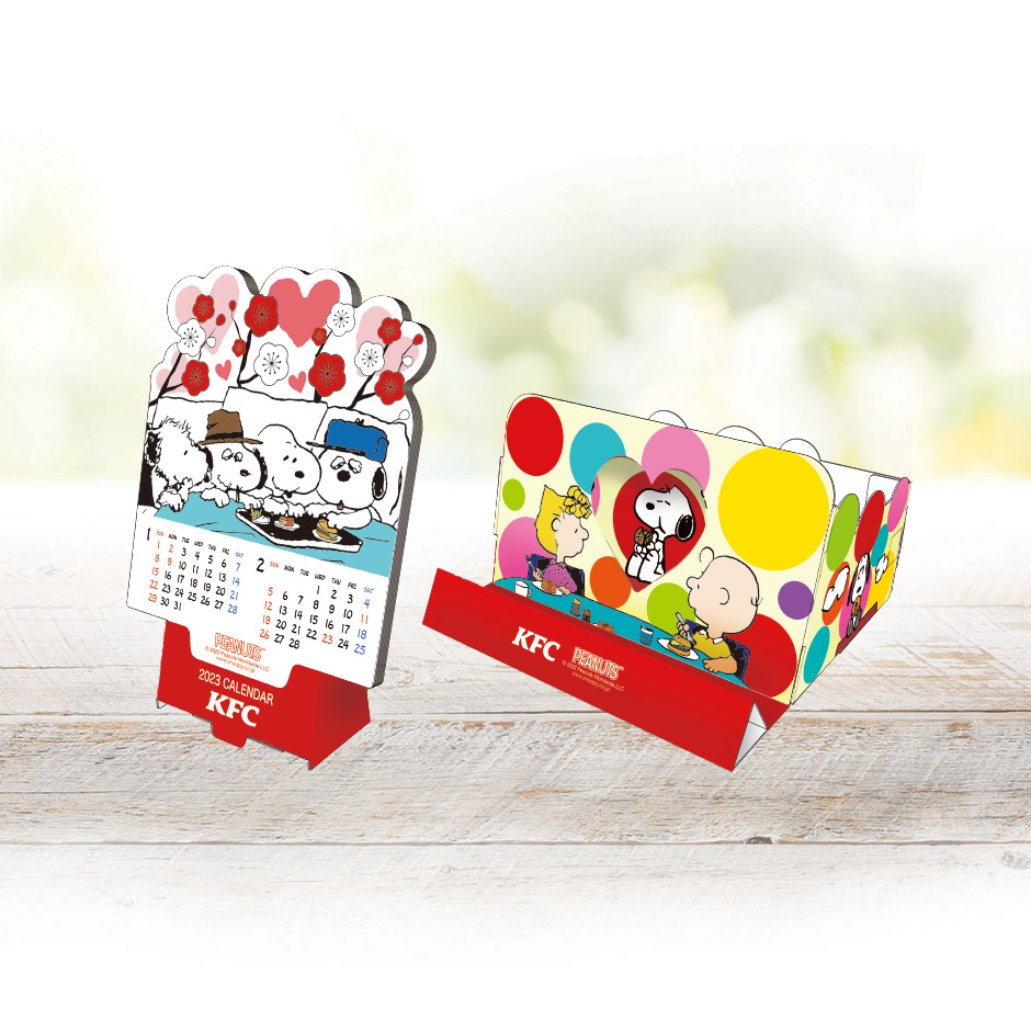スヌーピーコラボグッズ第2弾「スヌーピーとなかまたちカレンダー」と「マルチこものいれ」は、2022年12月26日より、全国のケンタッキーフライドチキン店舗に登場です。