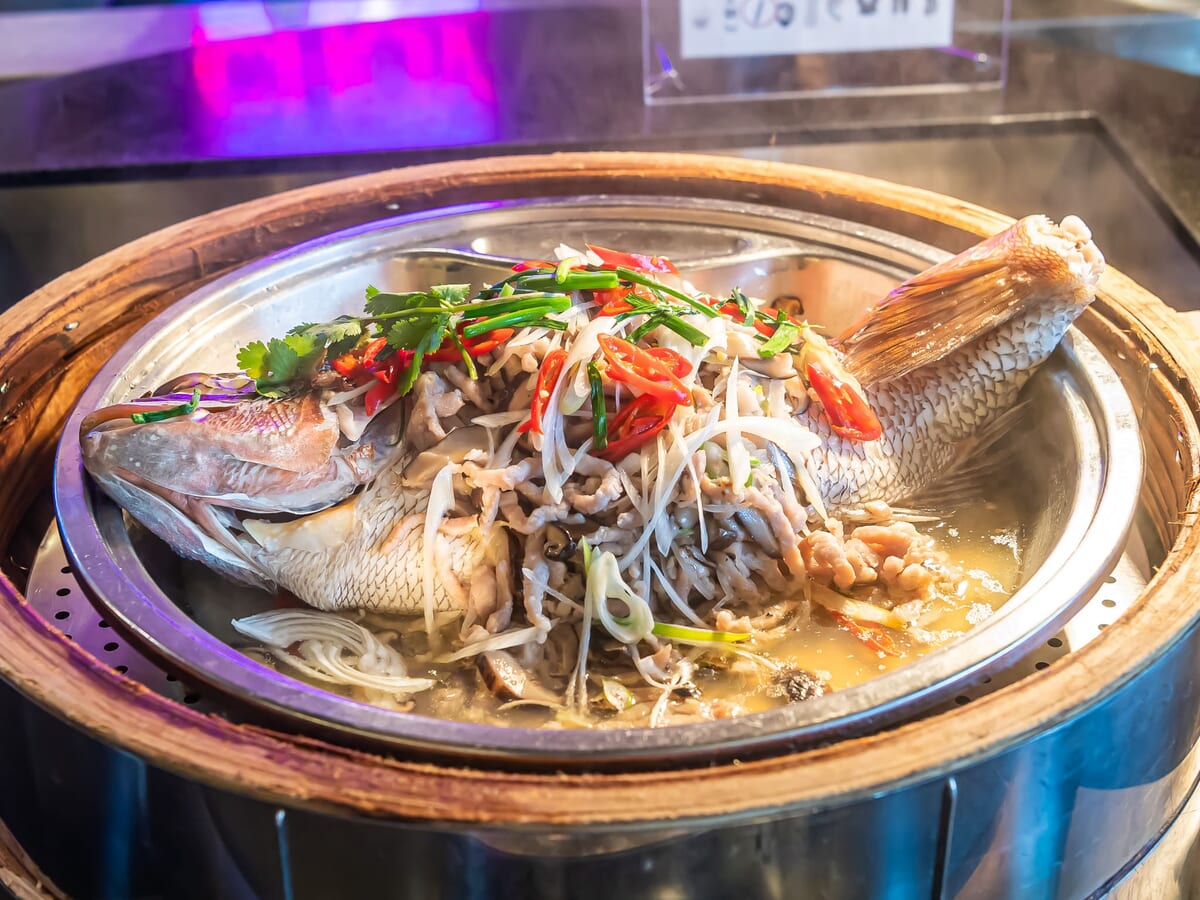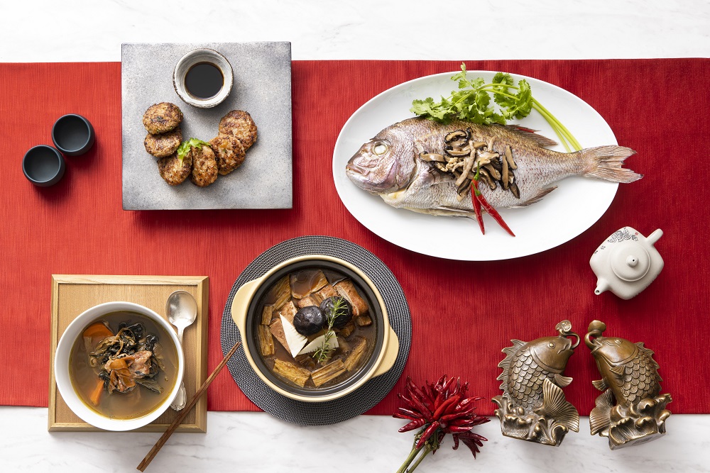 豪快に蒸し上げた鯛に甘辛く味付けした豚細切り肉と干ししいたけをのせ、香り豊かな香草や長ネギを添えた、香港流のおもてなしメニュー「真鯛の中華蒸し」も登場します。