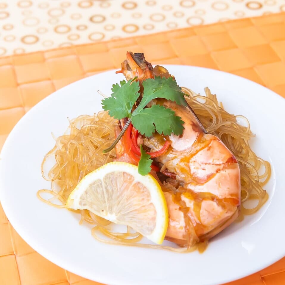 有頭エビと春雨を紹興酒やナンプラー、醤油等と一緒に炒め、仕上げられた一品です。