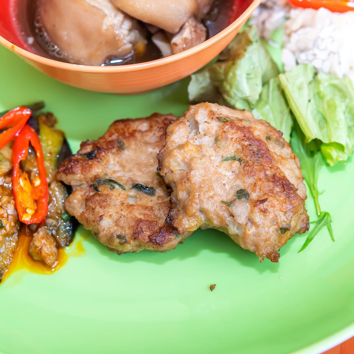 「レンコン餅」は干しエビやエシャロット、香草とレンコンを練り込んだ豚バラミンチ肉を焼き、オイスターソースと一緒に楽しむメニュー。