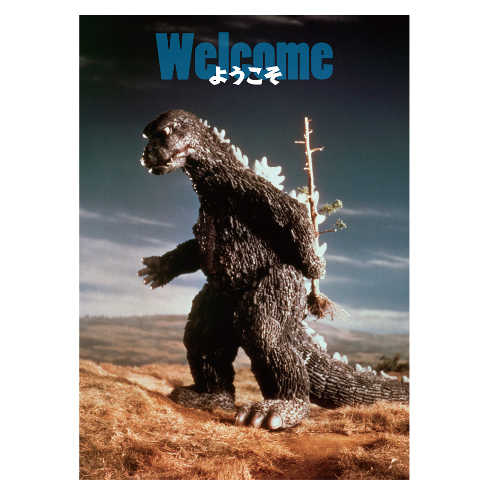 「ゴジラ」が「ようこそ」とあいさつをするグリーティングカードです。