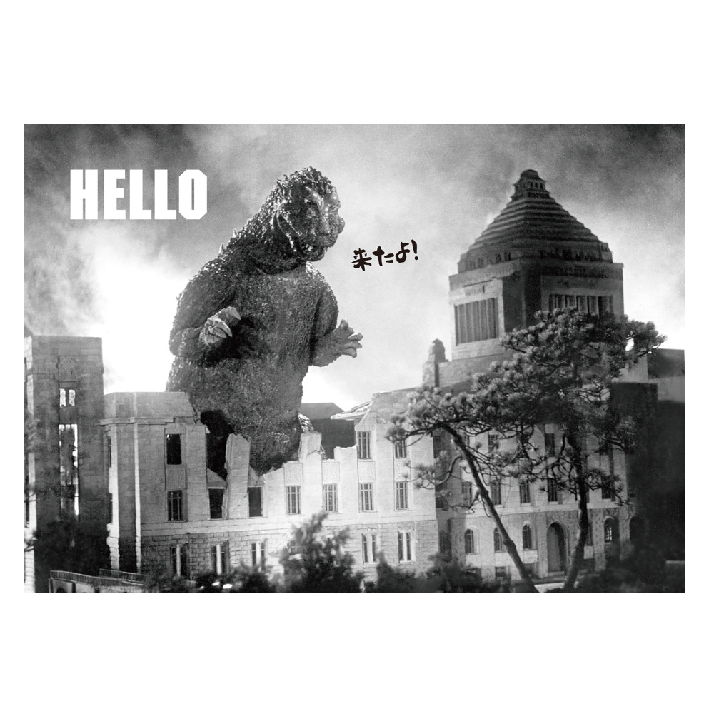 「HELLO」とフレンドリーに「国会議事堂」に挨拶をする「ゴジラ」