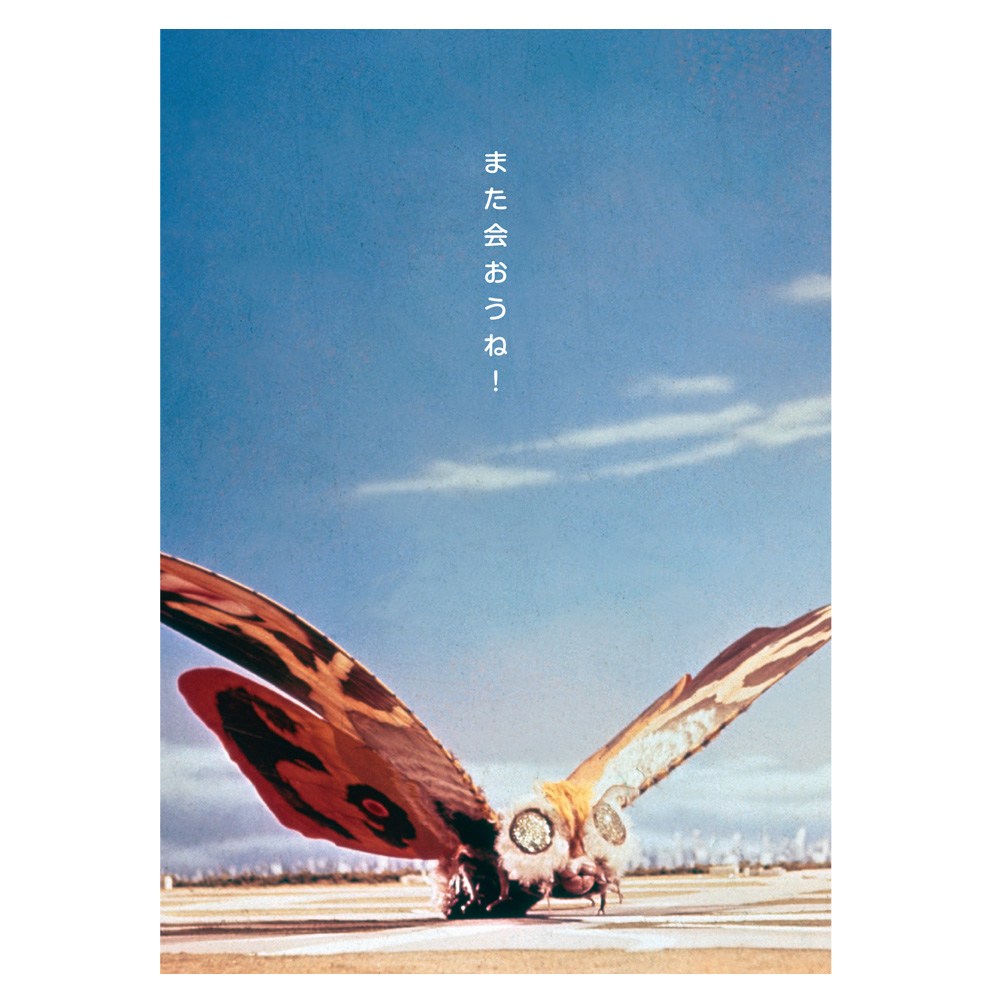 島に帰る「モスラ(成虫)」が「また会おうね!」と言っているような、すてきなデザイン。