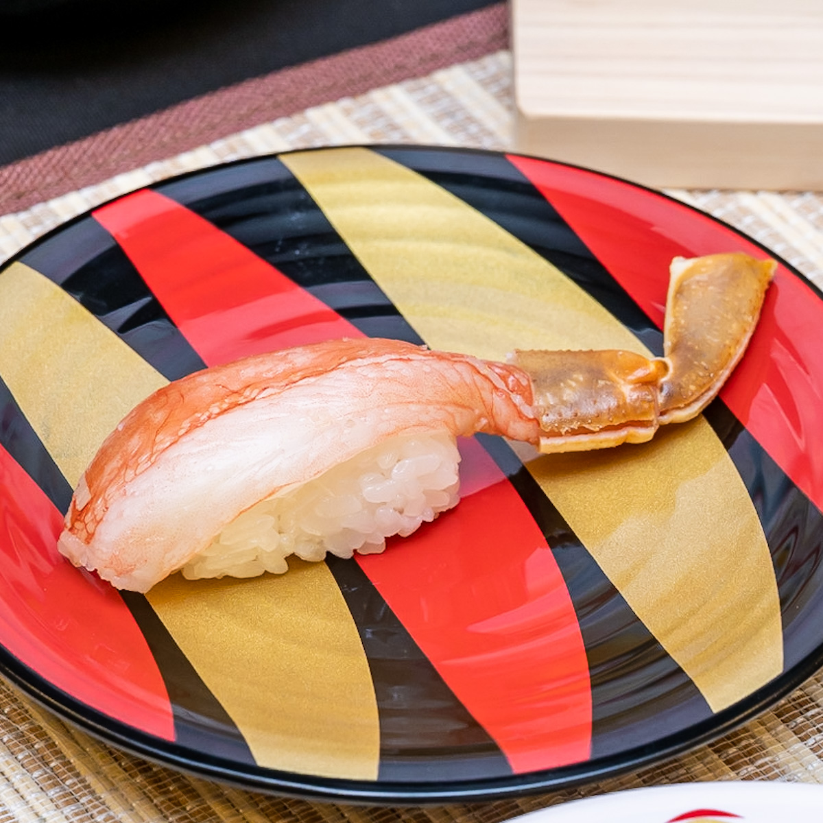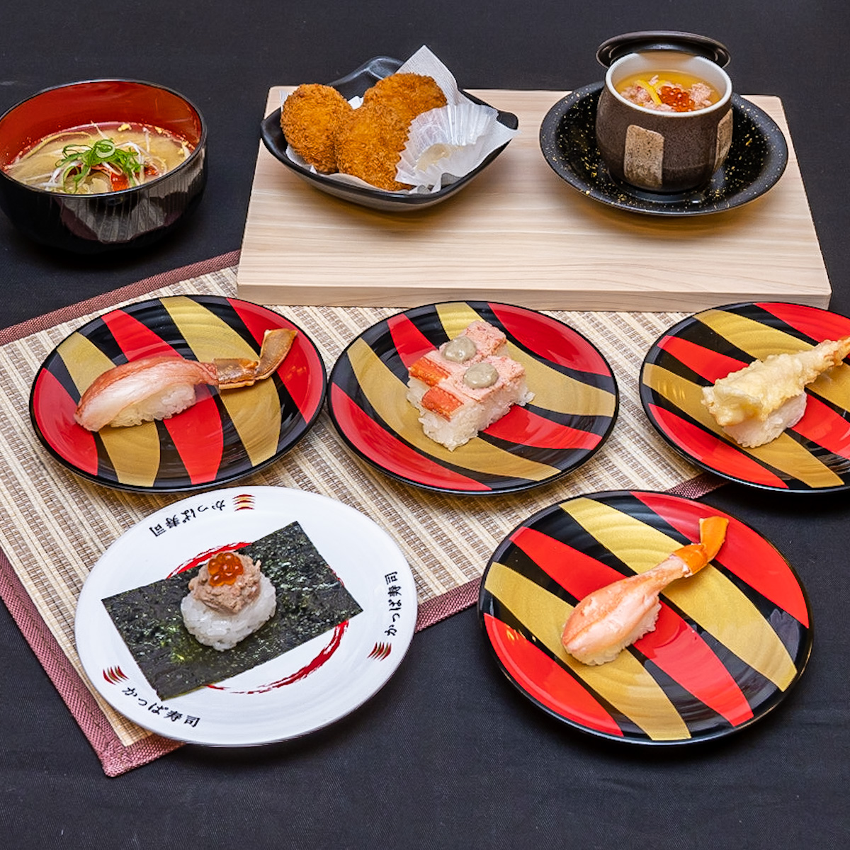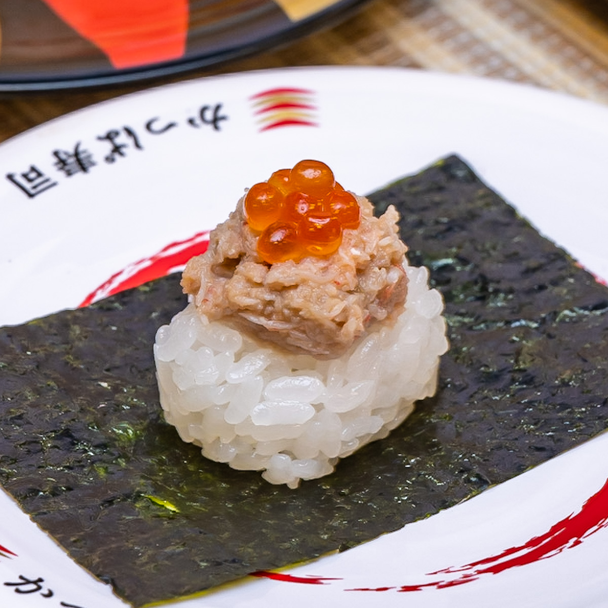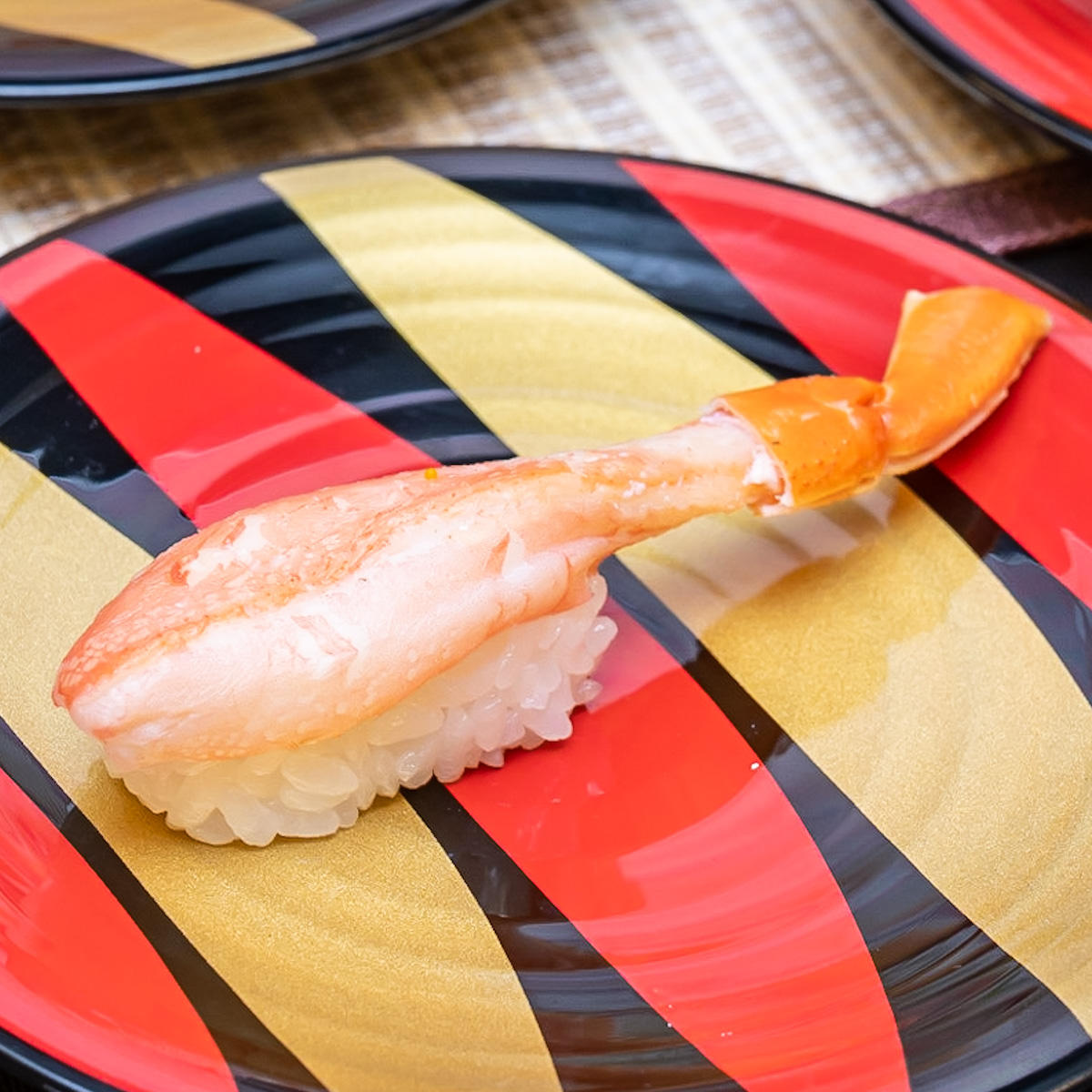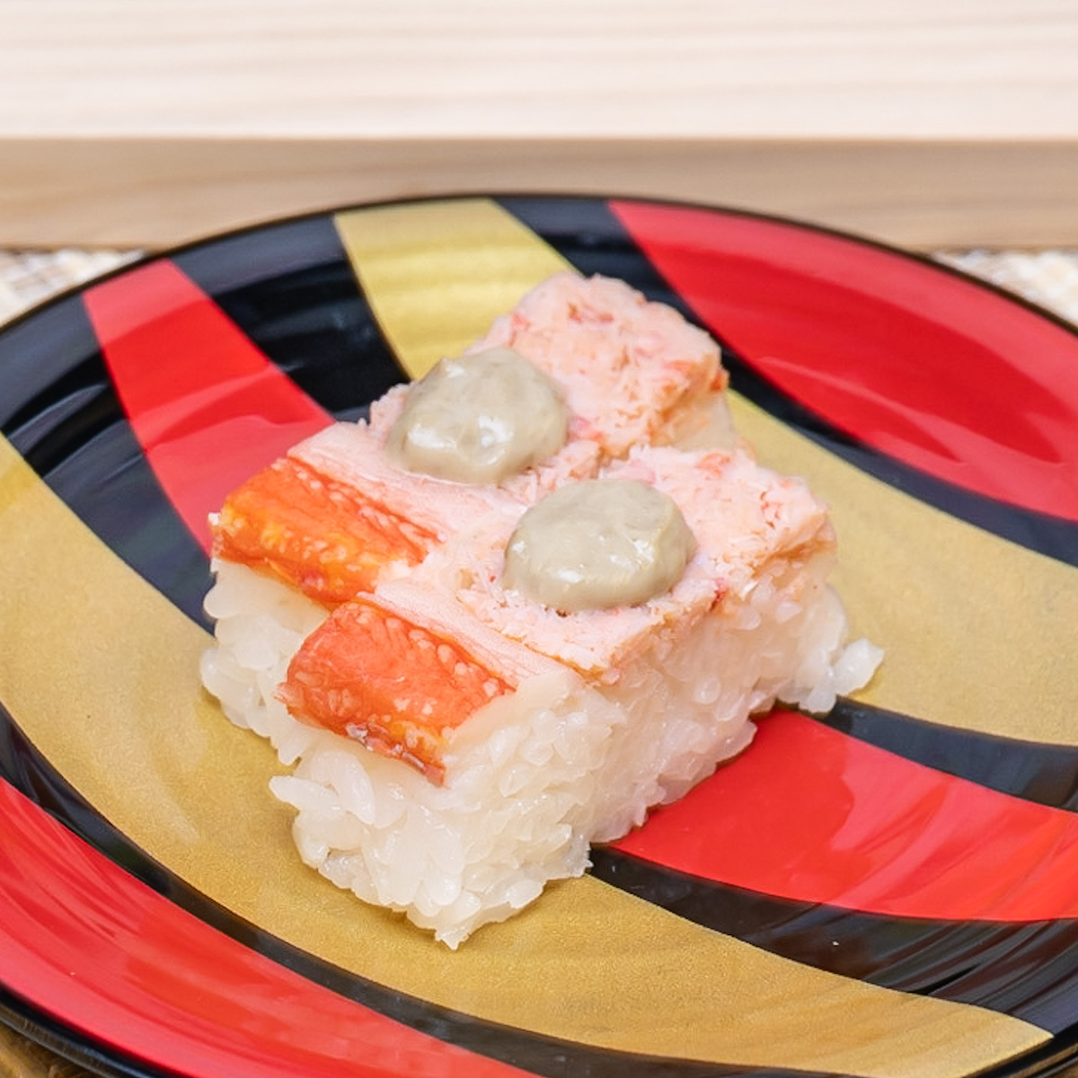 蟹のほぐし身、棒肉、蟹味噌、3種類の「蟹」を活かした、かっぱ寿司オリジナルの「押し寿司」