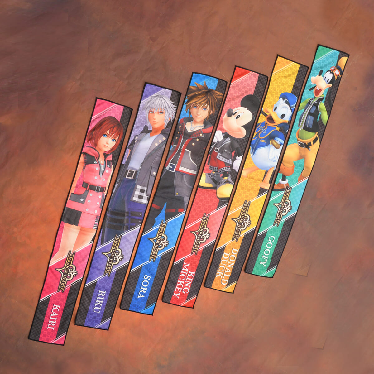 『キングダム ハーツIII』の衣装をまとったキャラクターたちが描かれたマフラータオル。