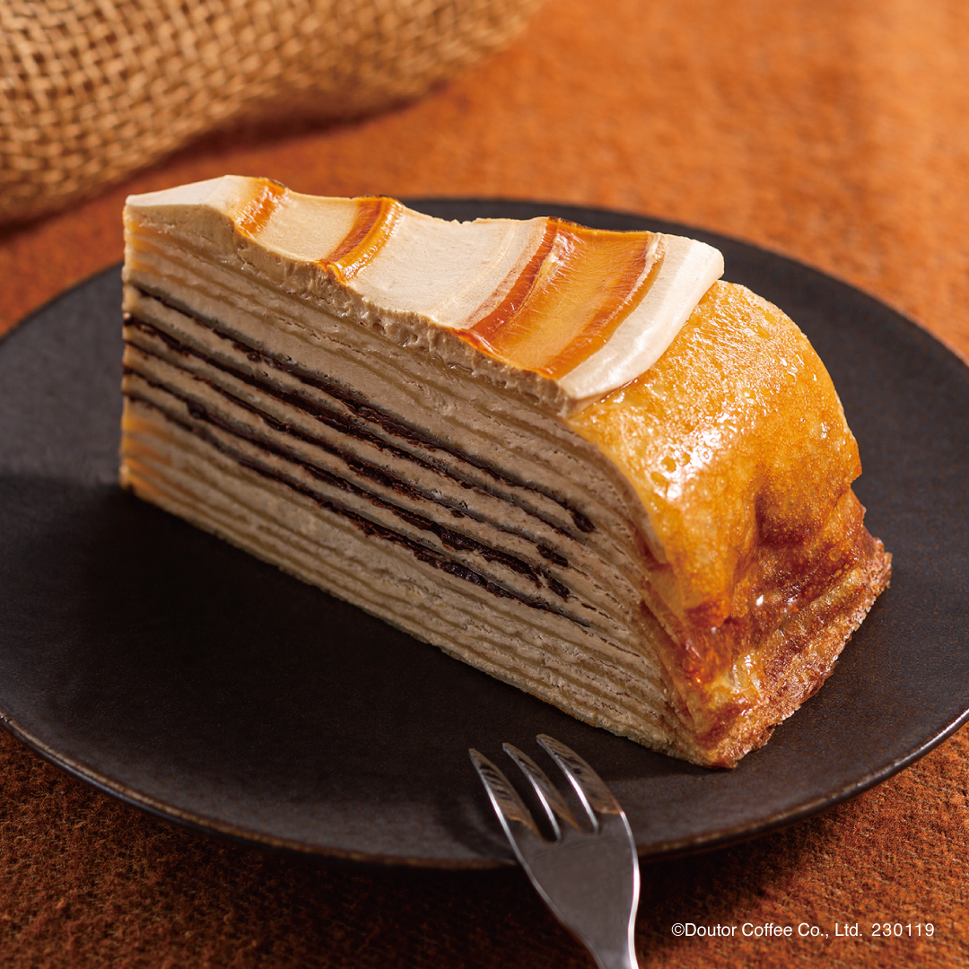 ドトールコーヒーショップの定番ケーキ「ミルクレープ」をキャラメル味にアレンジした「パリパリチョコ キャラメルミルクレープ」