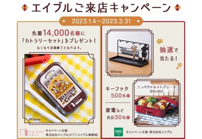 対象期間中に「MAISON ABLE」をきっかけに来店された方の中から先着14,000名に、エイブルオリジナル ディズニーデザインの「カトラリーセット」をプレゼント!