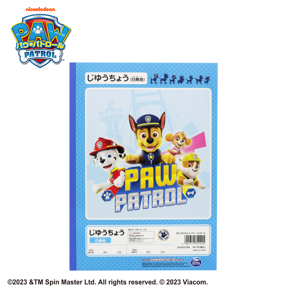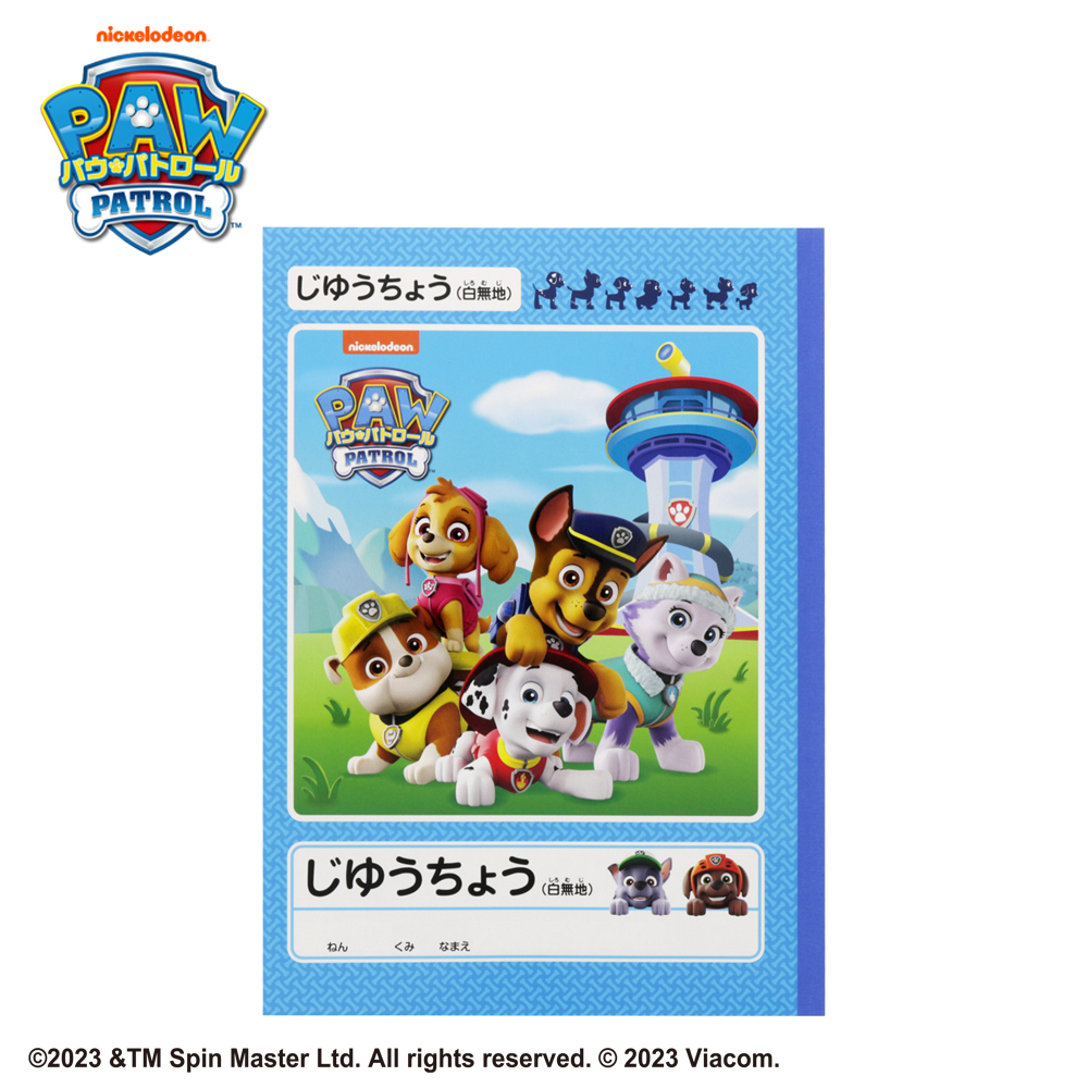 「パウステーション」を背景に「チェイス」たちが集合した賑やかなデザインの自由帳。