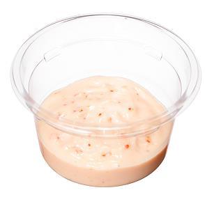 約12mmの粗めに挽いたパン粉でサクサクの食感に仕上げたエビパティに、明太子のピリッとした辛味を効かせた「明太子マヨソース」を合わせています。