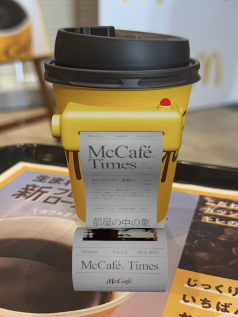 マクドナルド公式アプリからアクセスできるキャンペーンページからスマートフォンのカメラをカップにかざすと、画面の中でコーヒーカップから、ミニサイズの新聞『McCaféTimes』が出力されます。