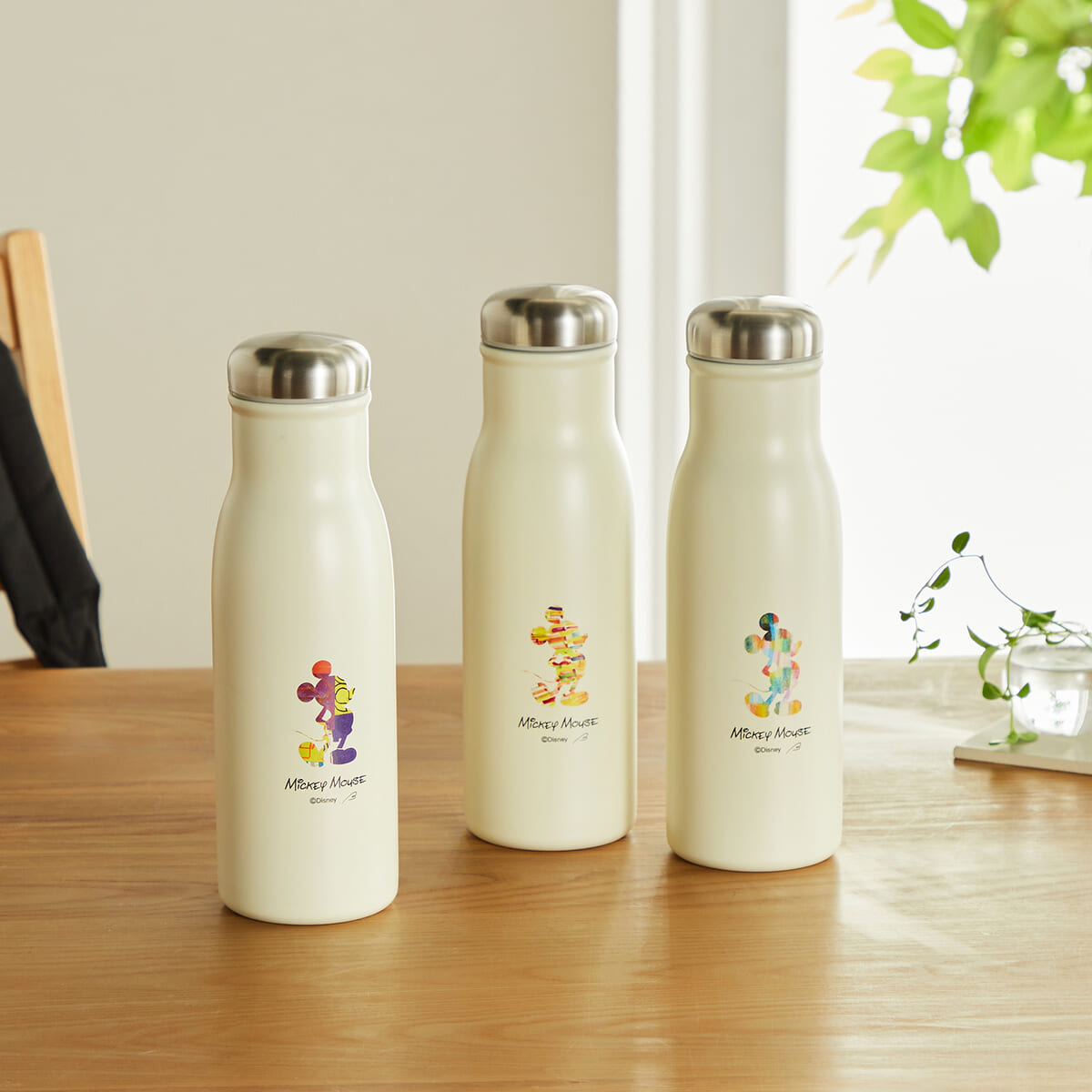 「ミッキーマウス」のシルエットがプリントされたステンレスボトル。