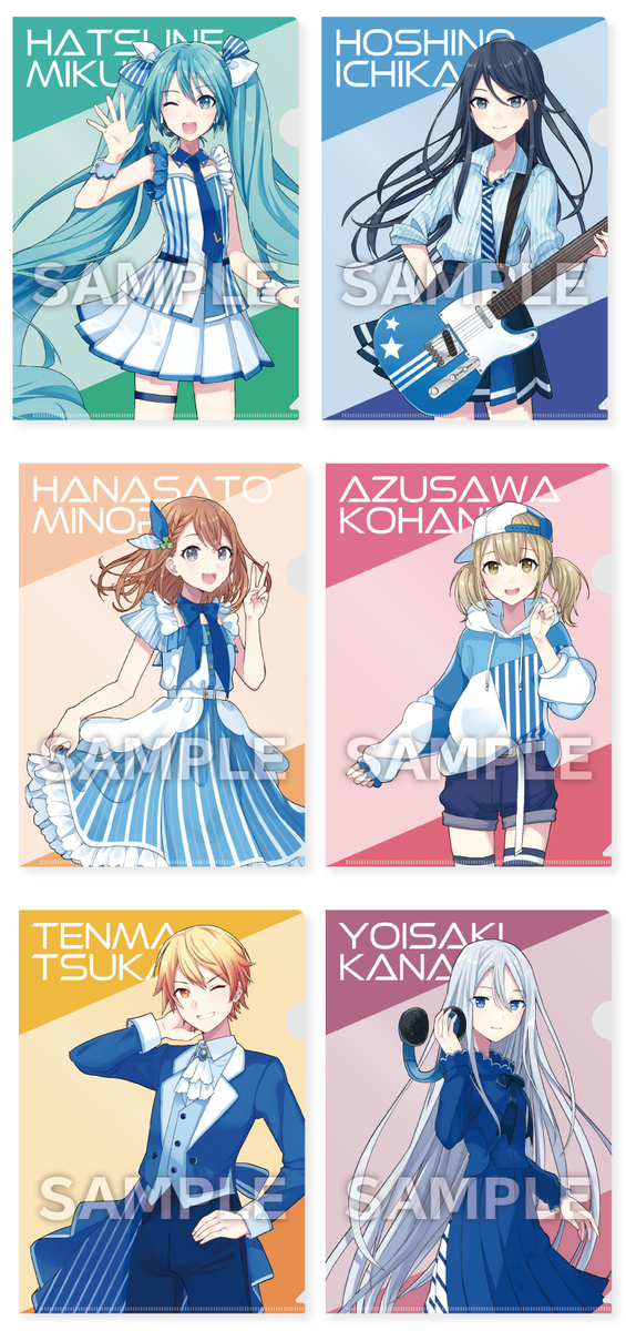 オリジナル衣装を着用した「初音ミク」「星乃一歌」「花里みのり」「小豆沢こはね」「天馬司」「宵崎奏」のクリアファイル。