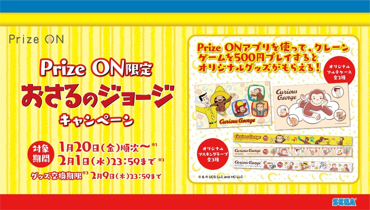 UFOキャッチャーをお得に遊べるセガのアプリ『Prize ON(プライズ オン)』にて「Pirze ON限定『おさるのジョージ』キャンペーン」を開催!