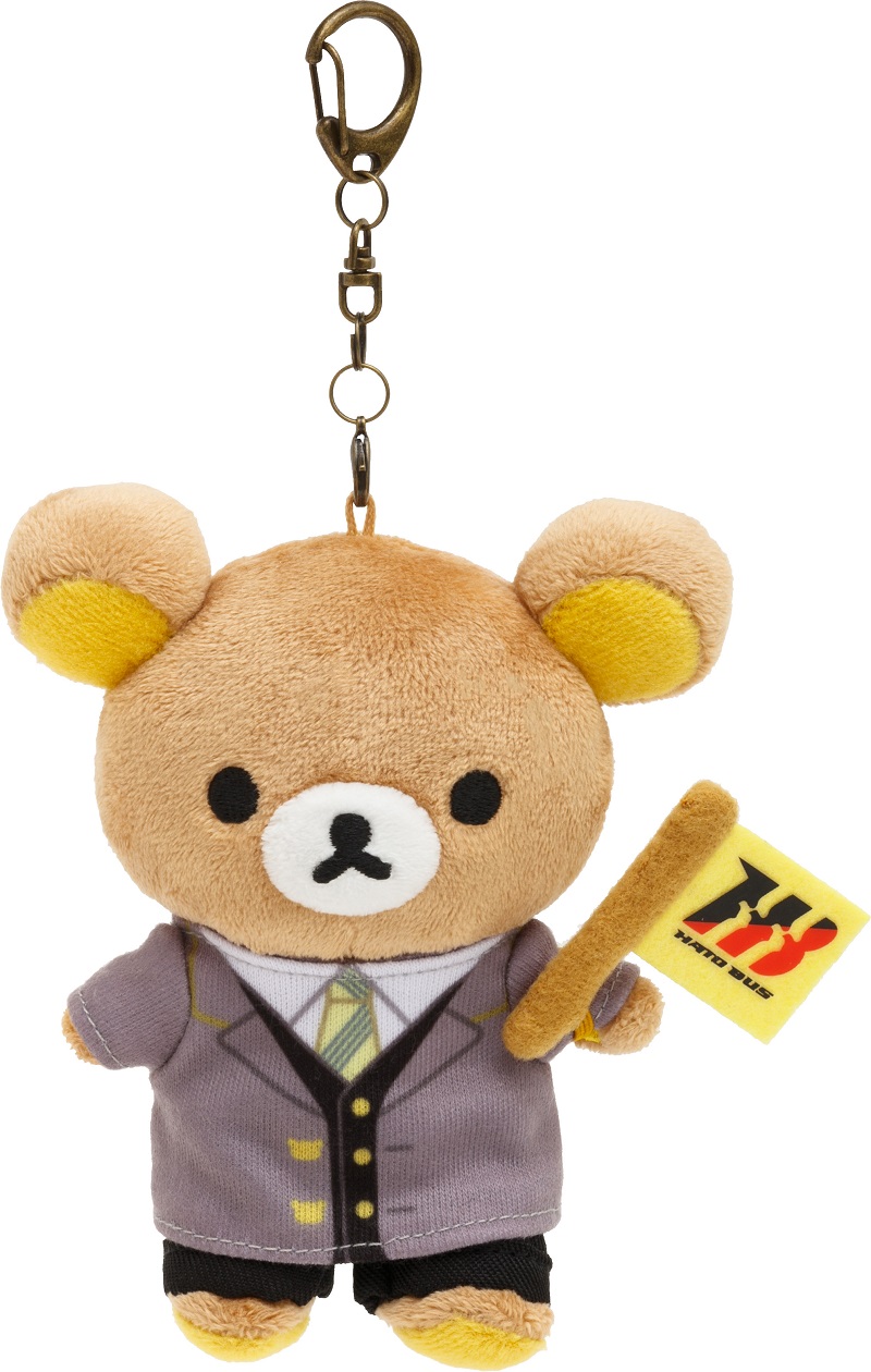 はとバスの旗を持った、「リラックマ」のぬいぐるみキーホルダー。