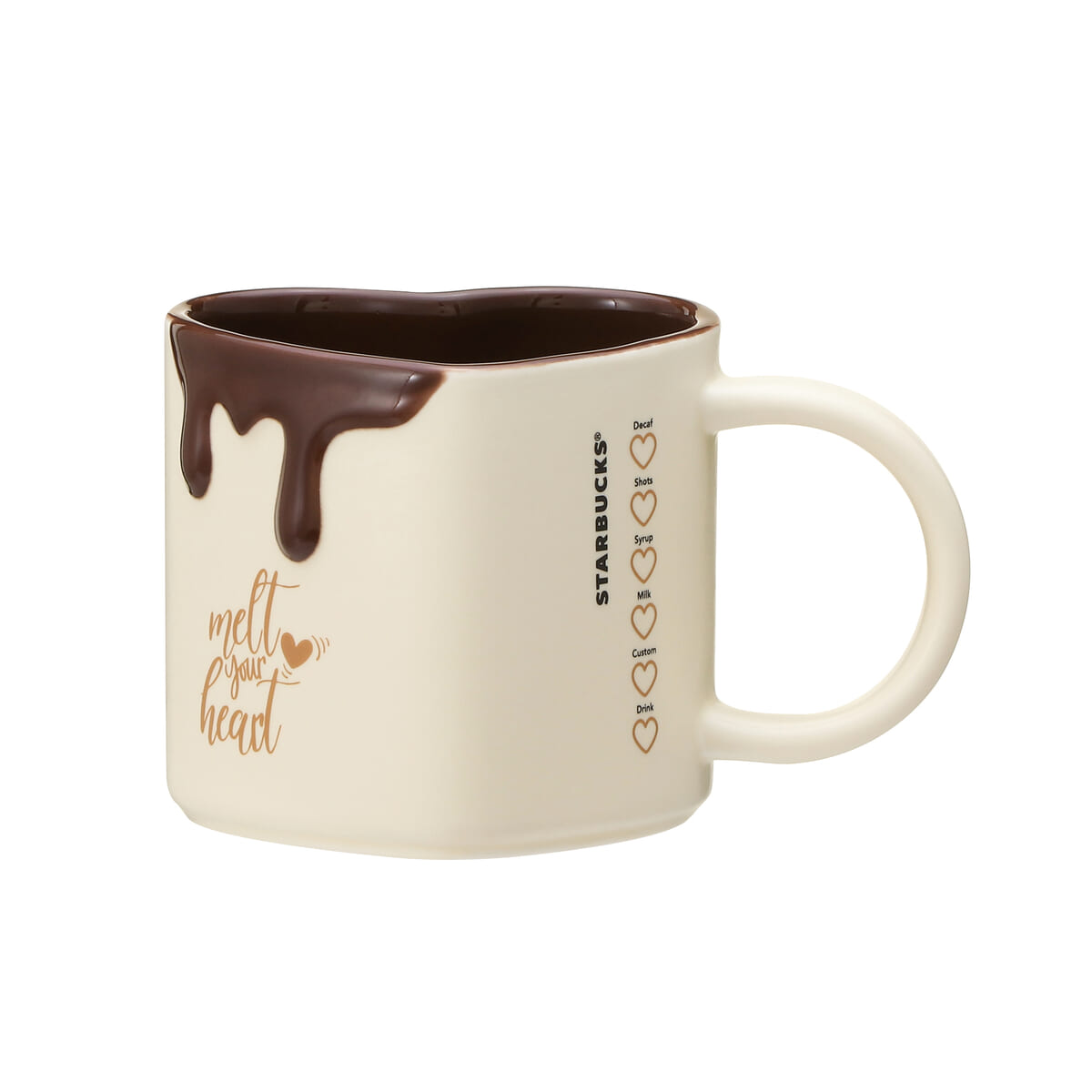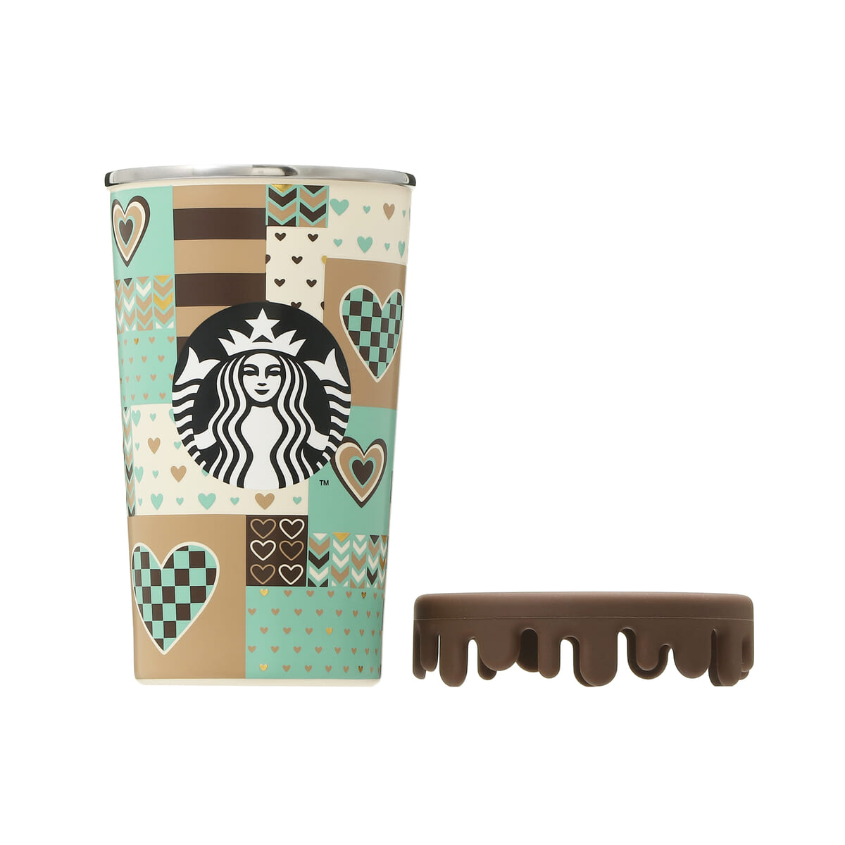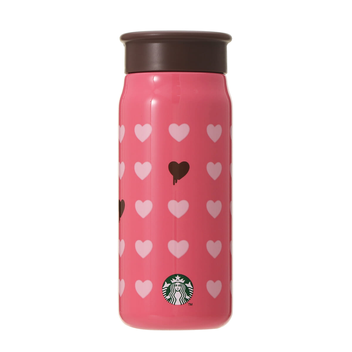 ハートが全面にあしらわれたピンクのカップに、ブラウンのメルティングハートやリッドが大人っぽいアクセントを添えています。