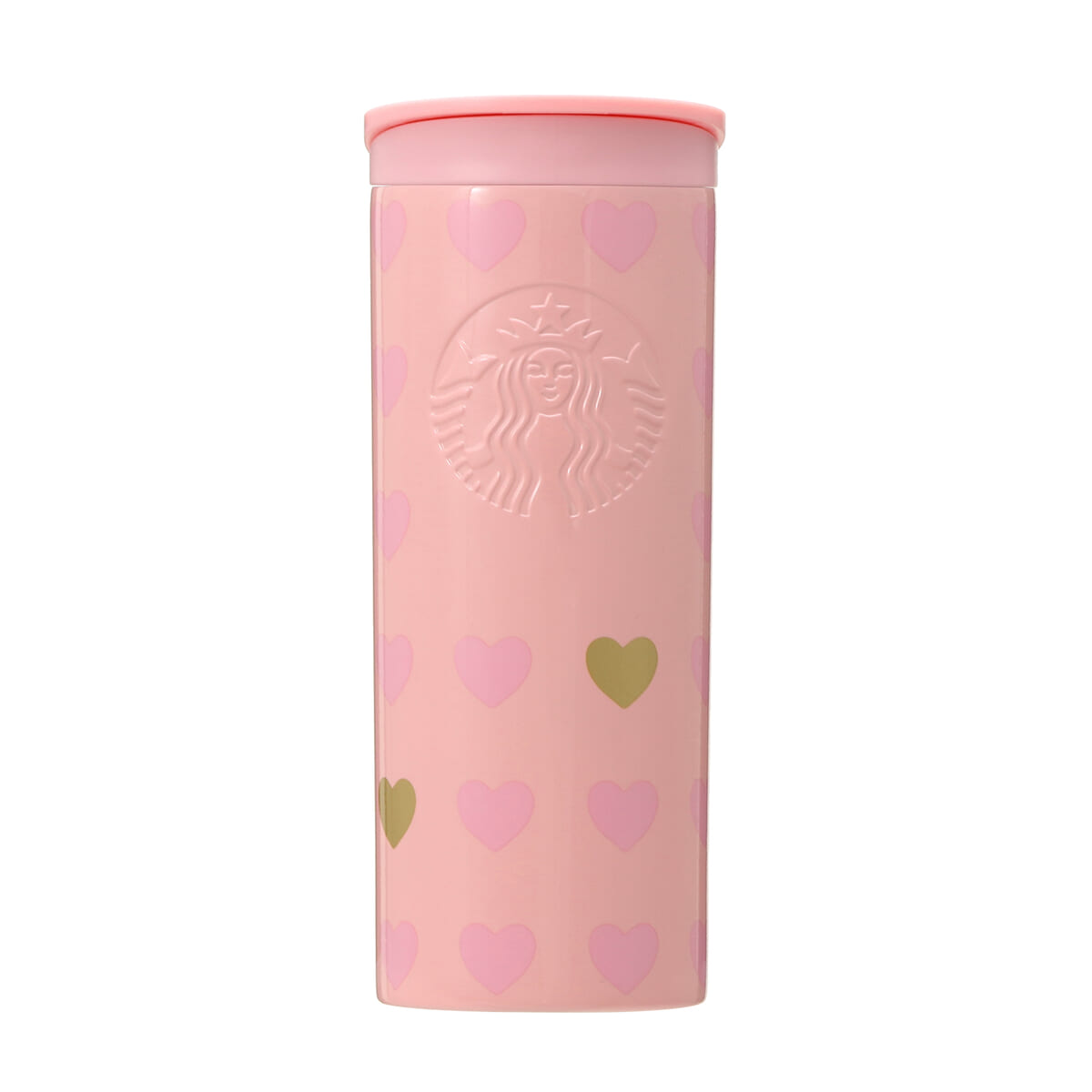 ピンクのボディに同色のハートが全面に散りばめられたステンレスボトル。