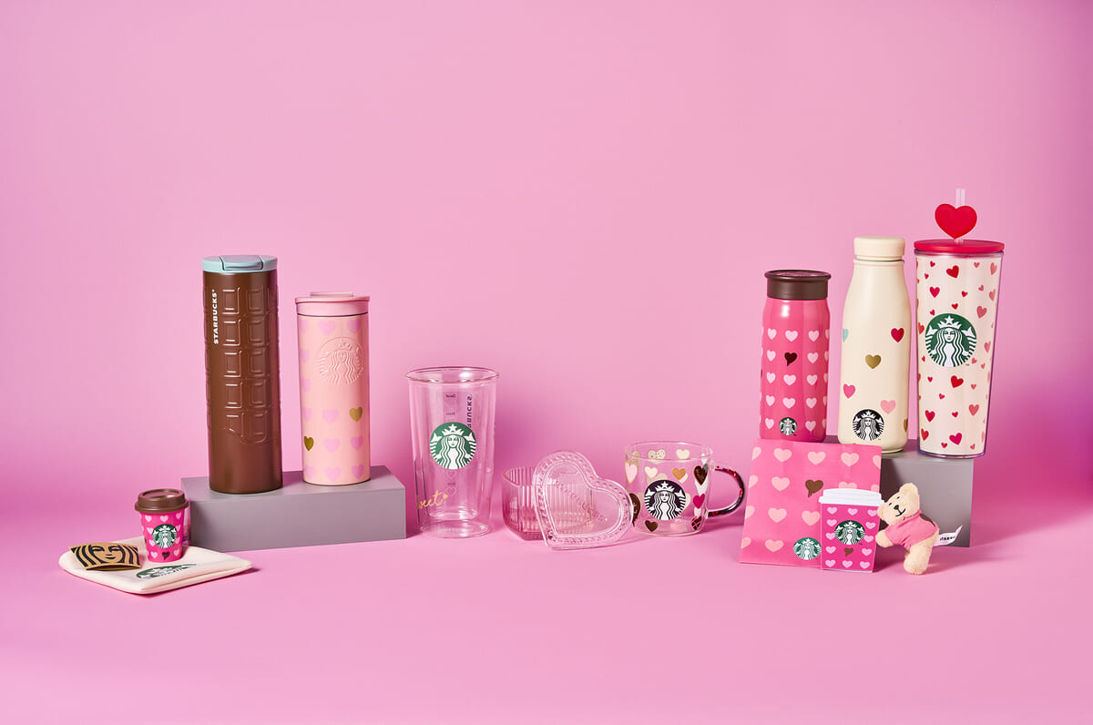 マグカップやタンブラー、ビバレッジカードなど豊富に展開されるバレンタイングッズ。