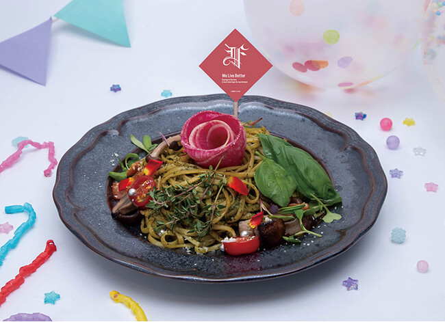 「柳美音」の専用スキル「エレガンス・シェル」での薔薇を紅芯大根で表現したジェノベーゼパスタ。