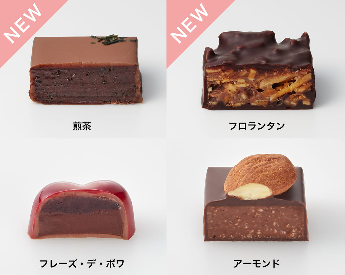 2023年の新作からは、ガナッシュに茶葉をくわえた「煎茶」とザクザクした食感が特徴の「フロランタン」をセレクト。