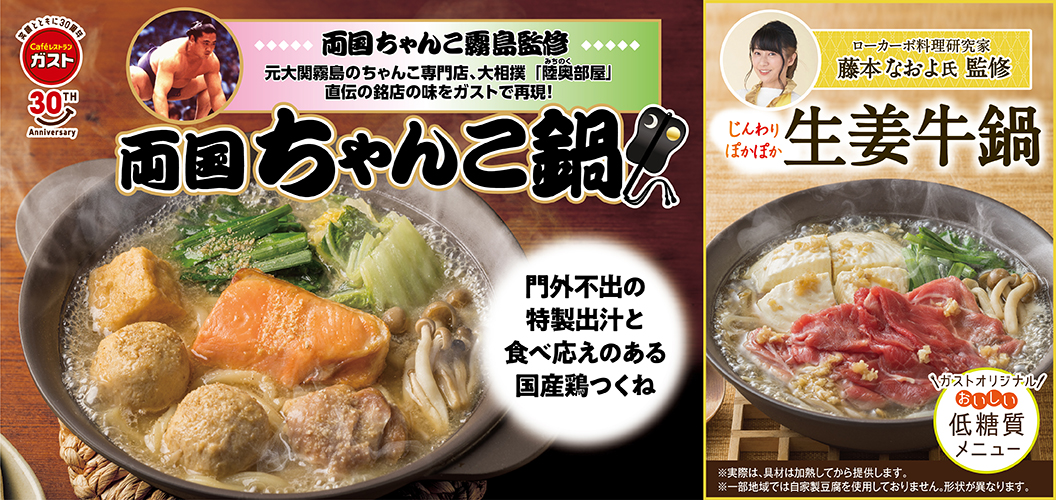 大相撲「陸奥(みちのく)部屋」直伝、「ちゃんこ霧島」監修の本格ちゃんこ鍋や、生姜たっぷり&低糖質なカラダの芯から温まるさっぱり牛鍋が登場します。