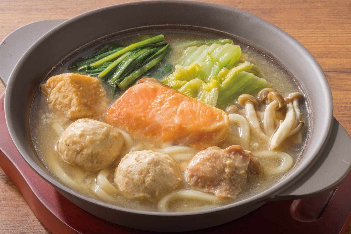 具材には同店監修の肉比率が高い国産鶏つくね、厚揚げ、鶏肉、鮭、白菜、ニラ、しめじに、半玉うどんを使用し、ボリュームも栄養も満点!