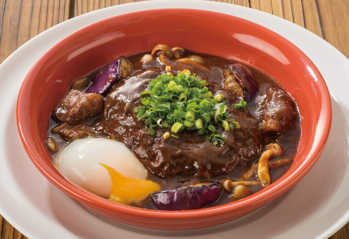ふっくらジューシーに焼き上げるこだわりのハンバーグステーキに、赤ワイン・デミグラス等をベースにしたソースで牛肉を柔らかく煮込んだ自慢のビーフシチュー、赤味噌やしめじを加えて仕上げた特製ソースをたっぷりとかけ、煮込み風に仕立てられています。