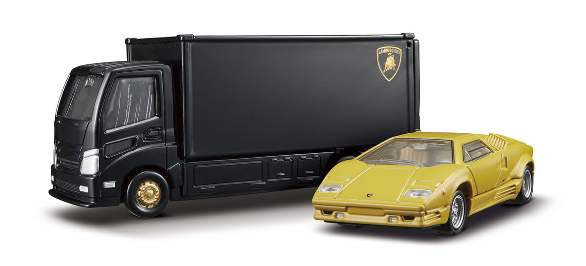 鮮やかな黄色の「Lamborghini Countach 25th ANNIVERSARY」と黒の車両積載車のセット。