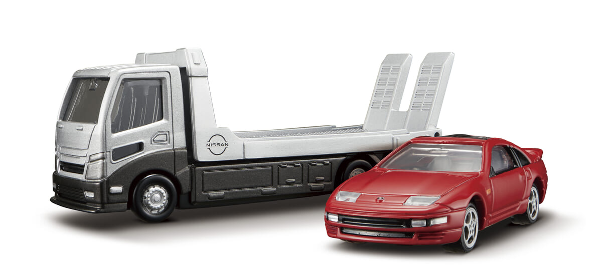 赤が目を引く「日産フェア レディ Z 300ZX ツインターボ」と日産のロゴの入った車両積載車のセット。