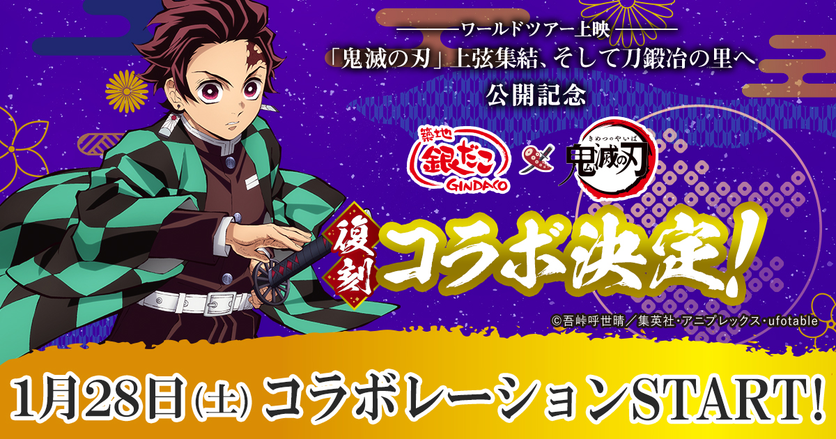 築地銀だこの『ワールドツアー上映「鬼滅の刃」上弦集結、そして刀鍛冶の里へ』コラボメニューは、2023年1月28日から全国の築地銀だこ店舗にて発売です☆