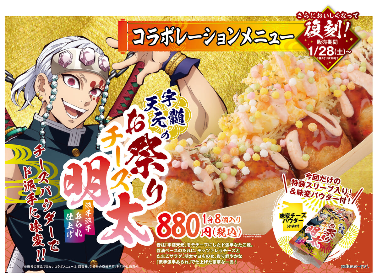 今回のコラボレーションでは「宇髄天元のお祭りチーズ明太(8個入り)」が “味変チーズパウダー”が付き、さらに美味しくなって復刻登場します。