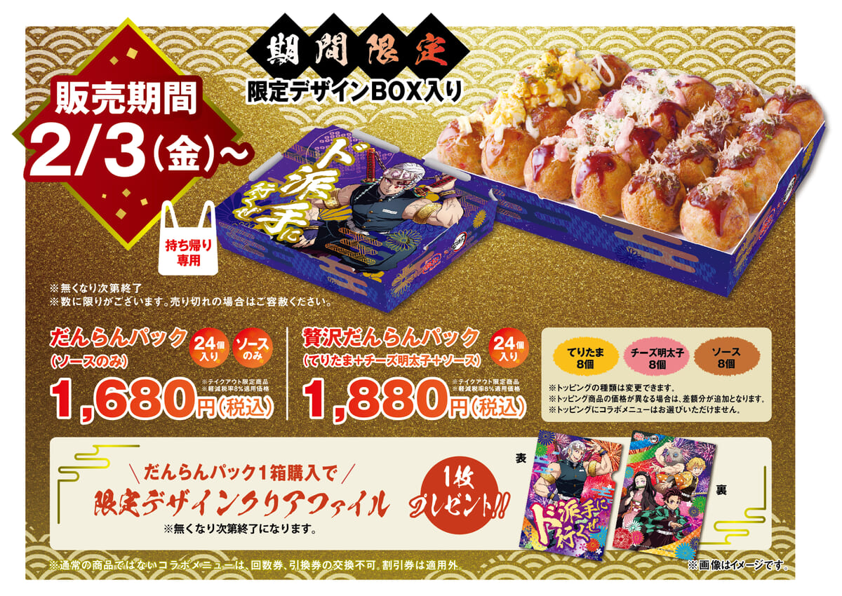 さらに、天面に「宇髄天元」が”ド派手”に描かれた「限定デザインBOX入りだんらんパック(24個入り)限定デザインクリアファイル付」もあわせて提供されます☆