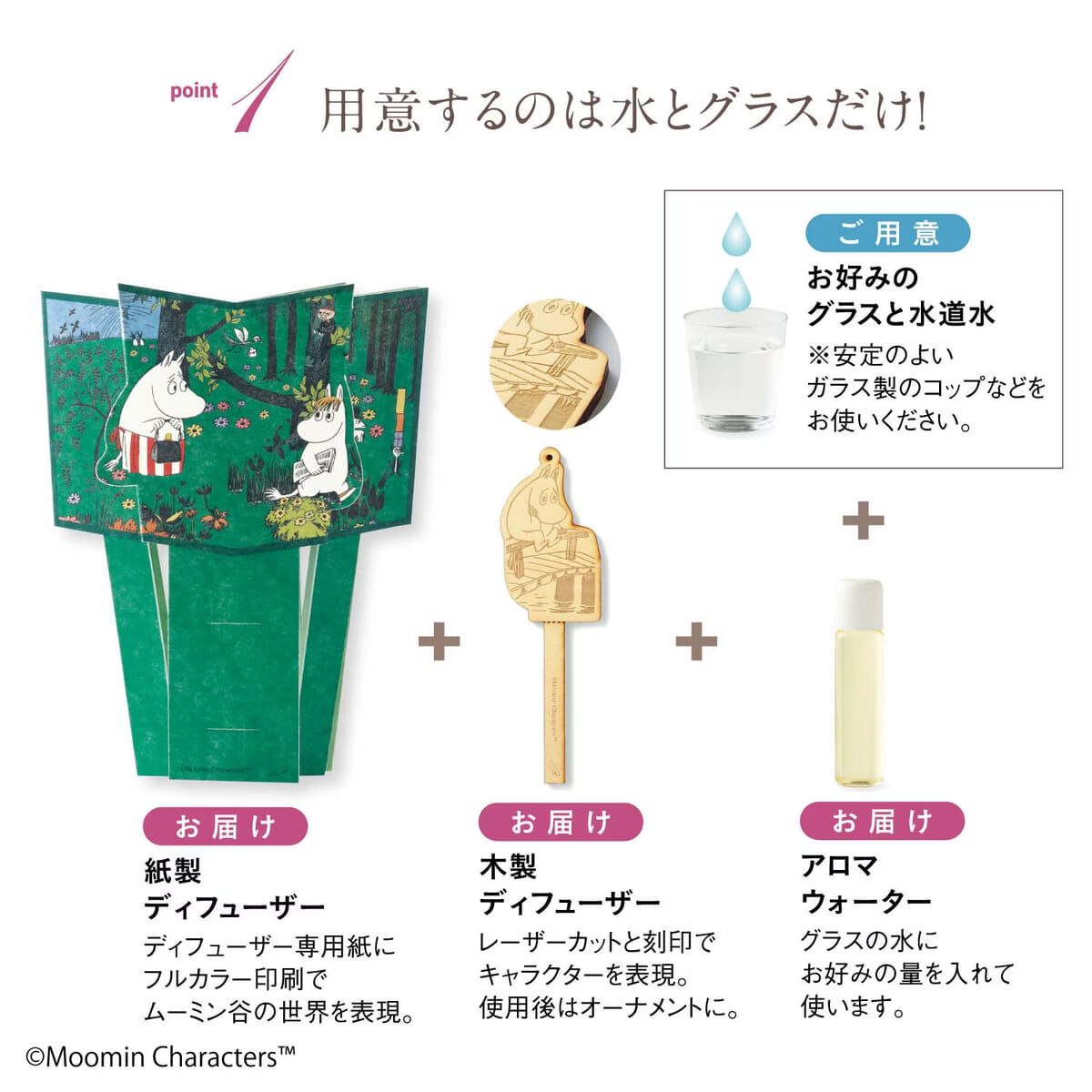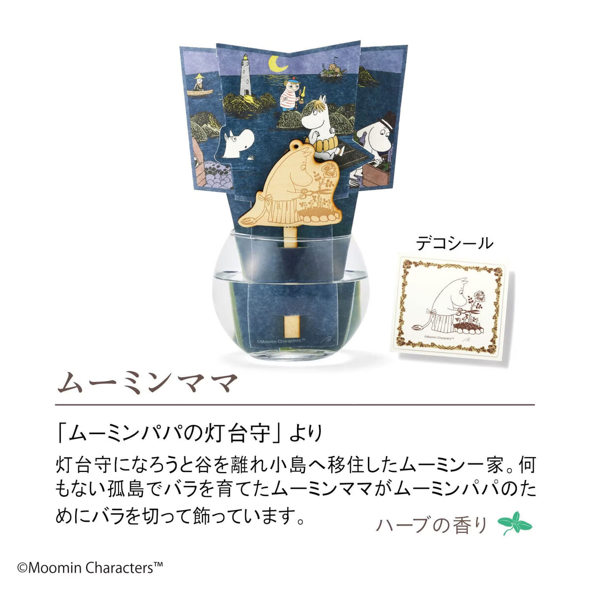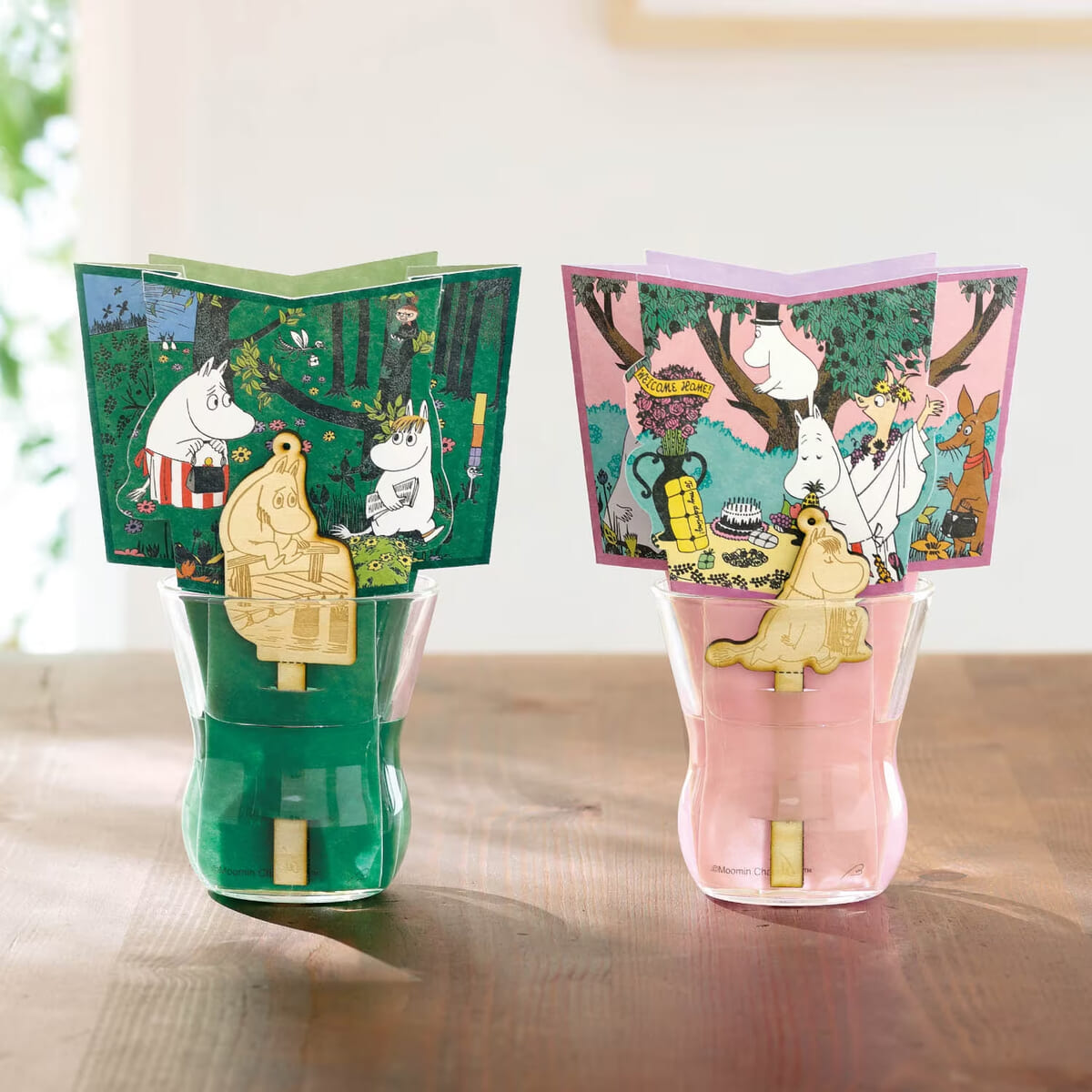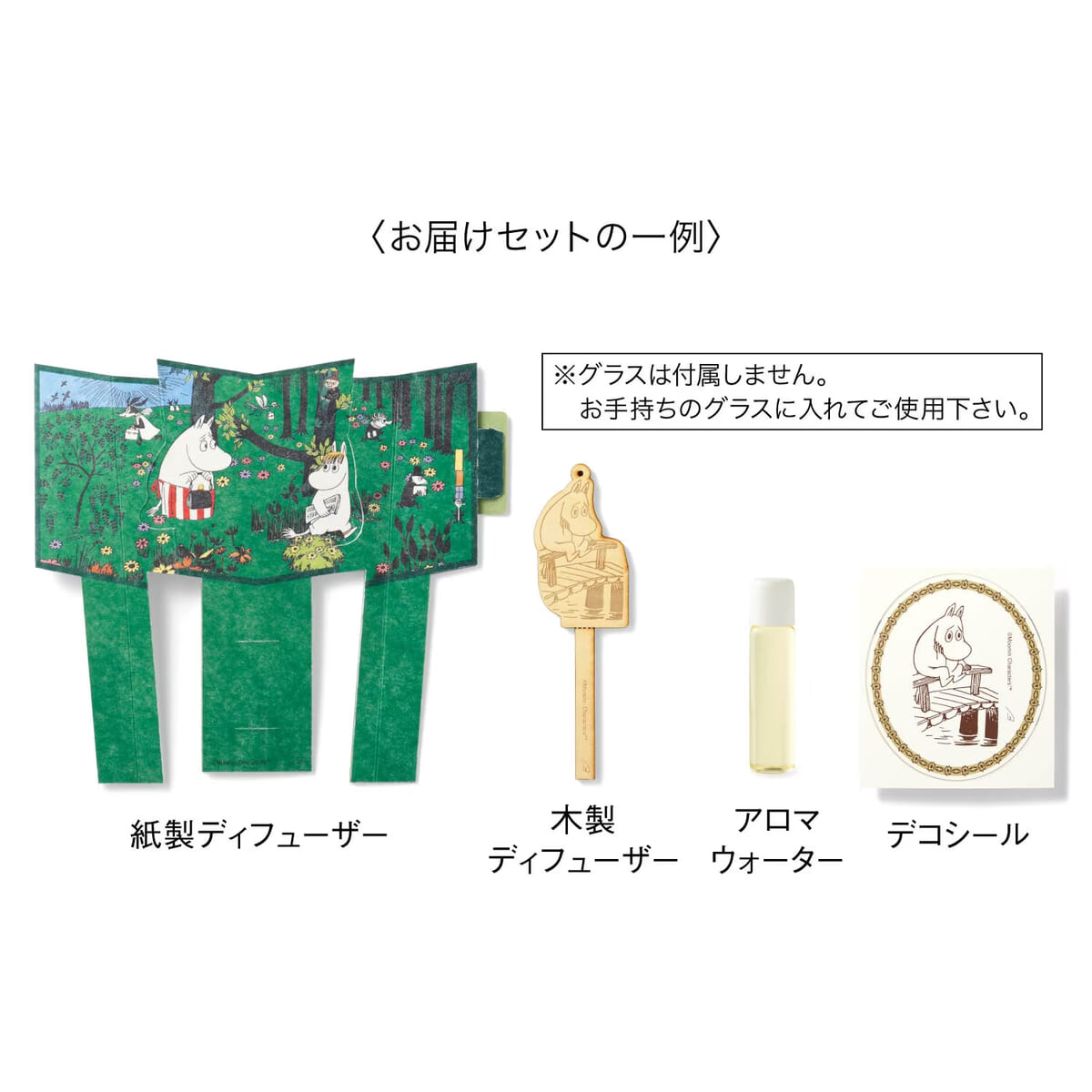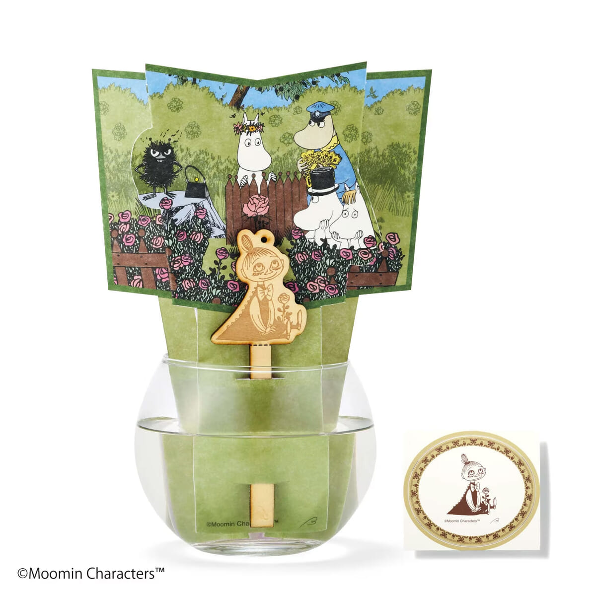 紙製ディフューザーには、緑が広がる森や色とりどりのお花の中に「ムーミンママ」や「スノークのおじょうさん」「リトルミイ」が描かれています。