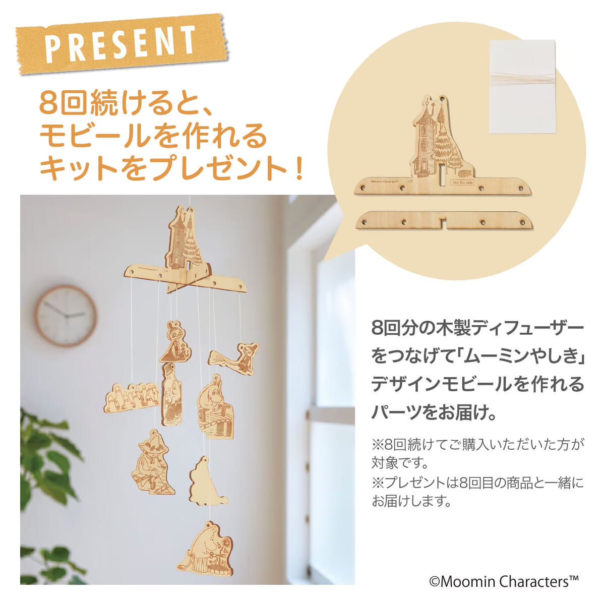 8回続けて購入すると、「ムーミンやしき」デザインモビールをつくれるキットがもらえます。