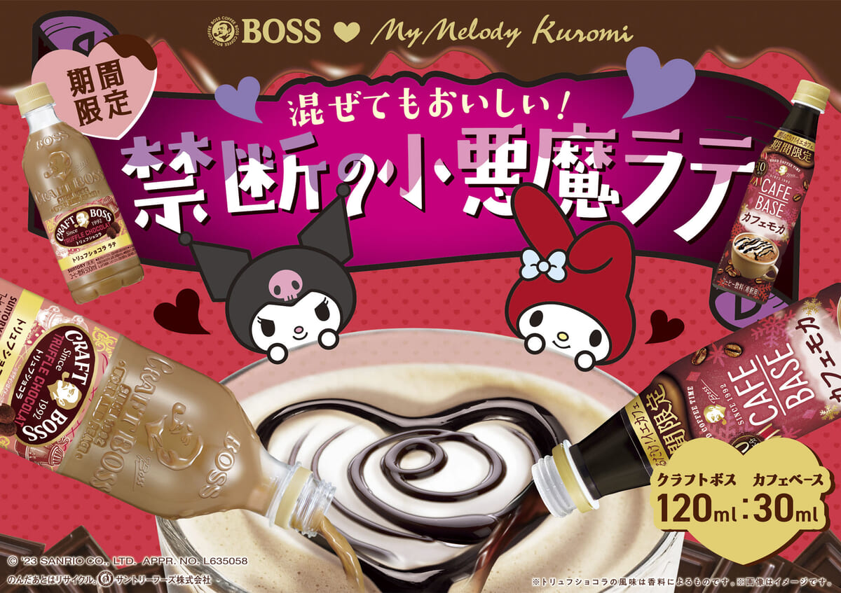 「禁断の小悪魔ラテ」など、サントリー「ボス カフェベース」シリーズを使った「マイメロディ」と「クロミ」のレシピの紹介でした。